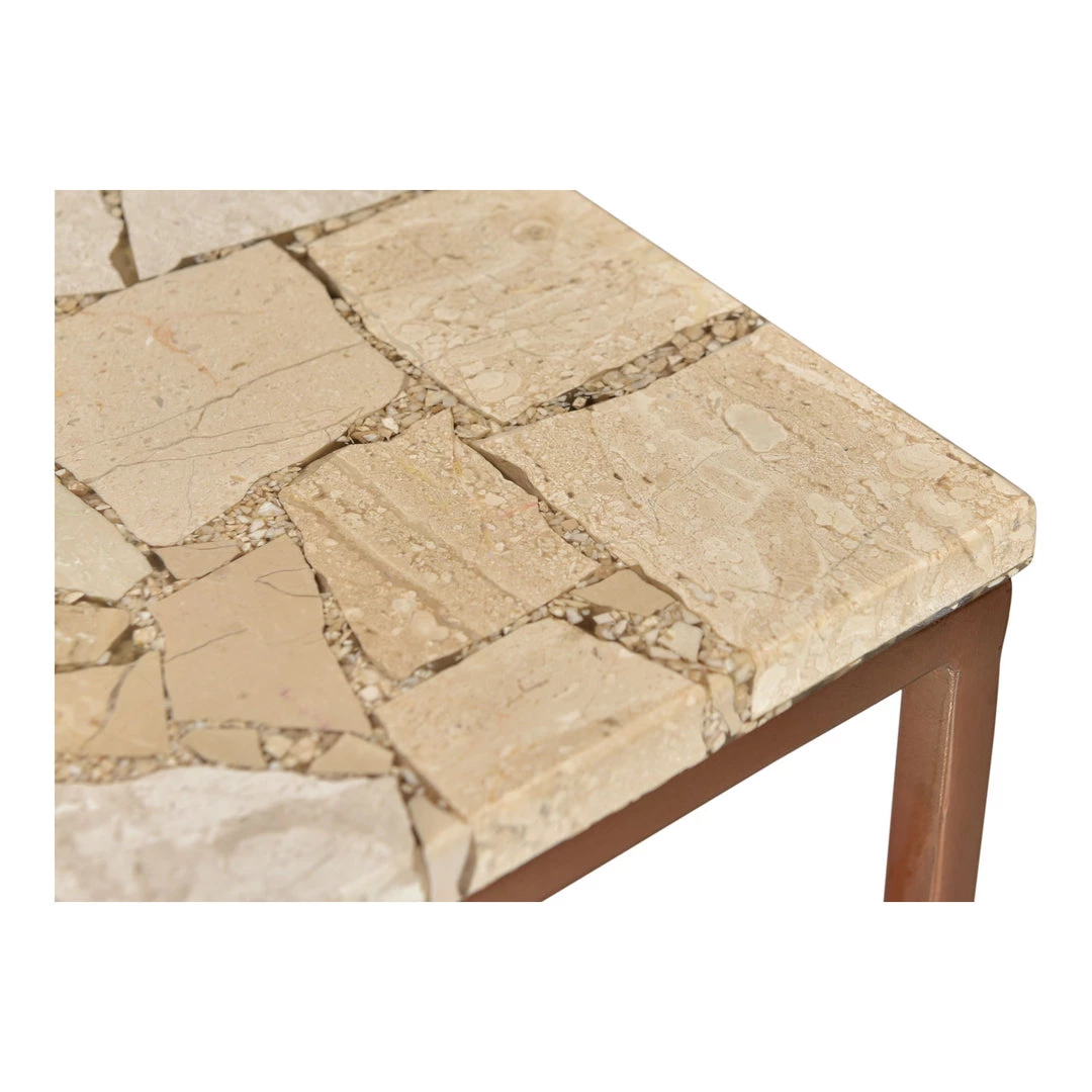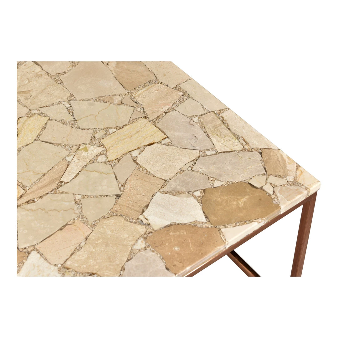 Old world and new world combine with the Moxie Coffee Table. Natural pieces of marble are combined with resin and are set atop a metal base giving this design an industrial modern feel. Design Made simple.