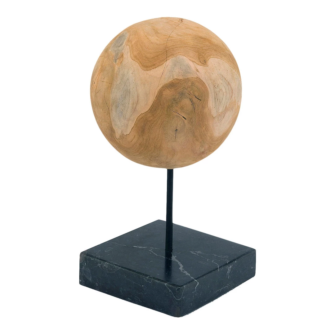 A reclaimed piece of teak shaped into a beautiful sphere, mounted on a marble slat, make this sculpture a showstopping contemporary accent piece.