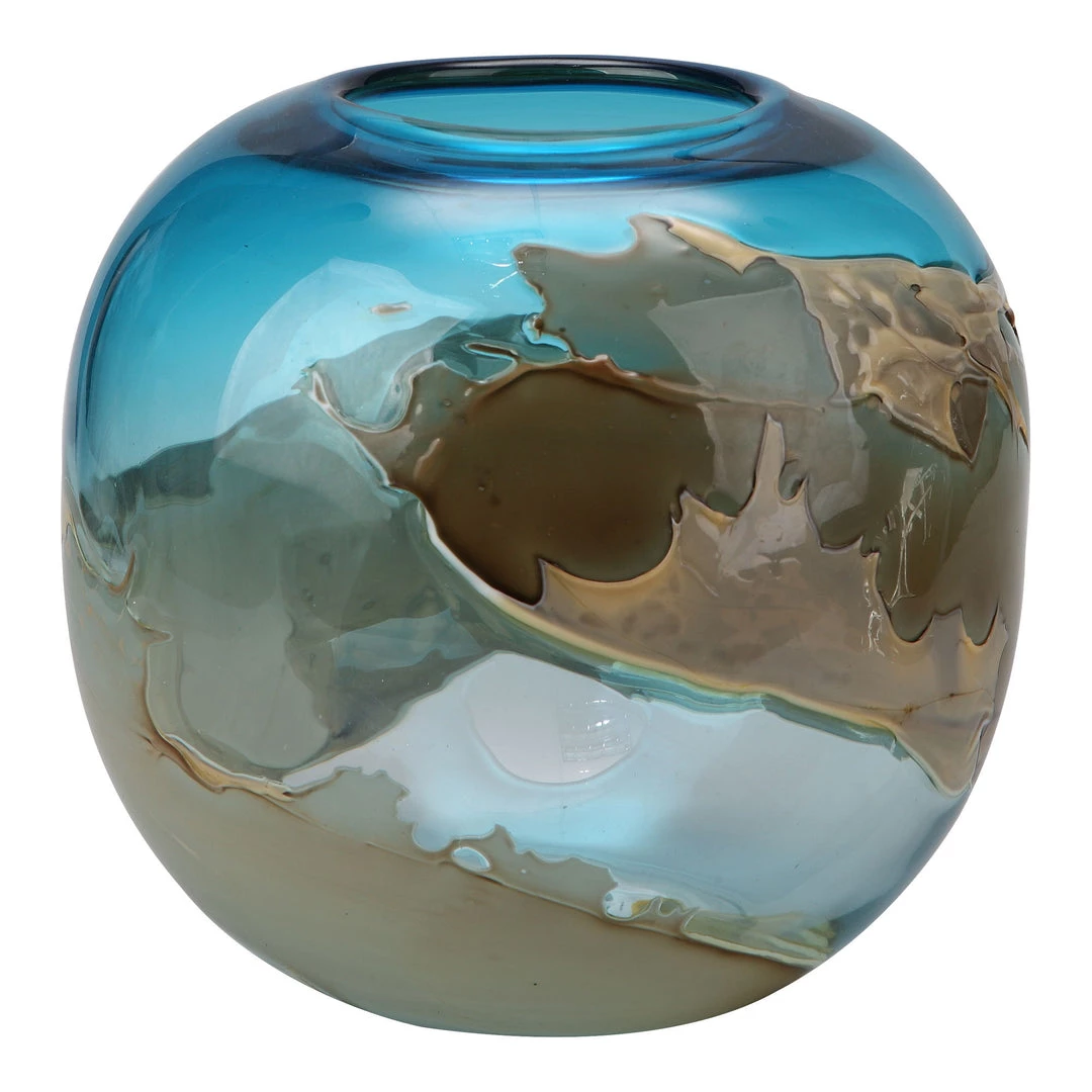 This vase has a glossy finish with blue and gold tones evoking a wave. A spherical design achieved with glass blowing, place it as an accent piece to add a pop of color.