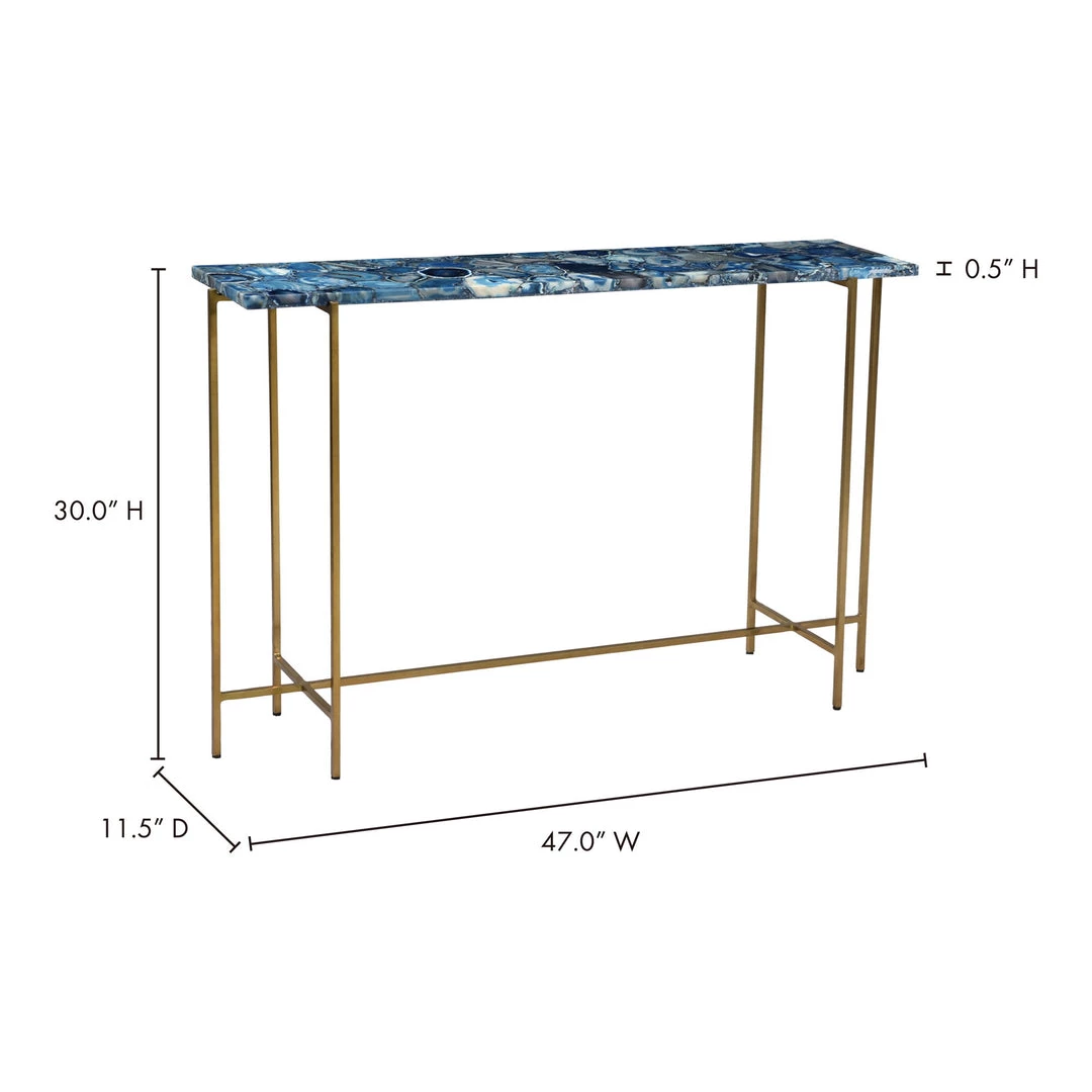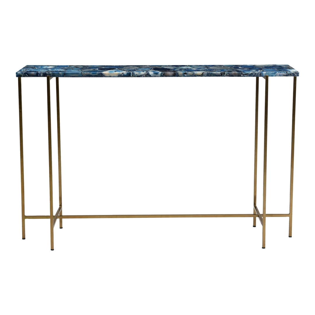 The clear-cut agate tabletop let the sparkling blue hues of the stone shine. A delicate gold-finished frame gives this art-deco console table elegance and durability.
