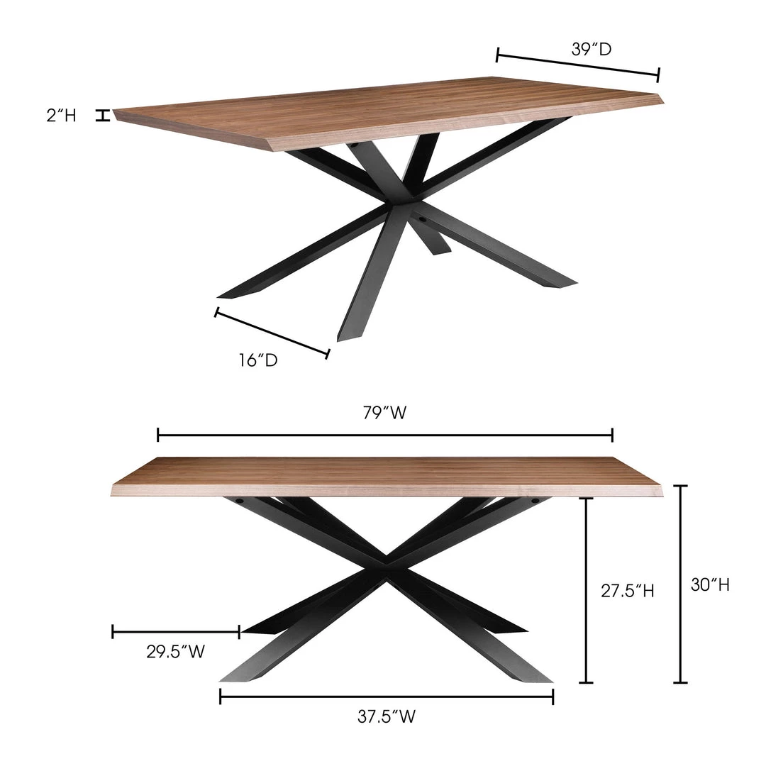 A sleek criss-cross base design matches with a walnut surface to create a contemporary dining table like no other.