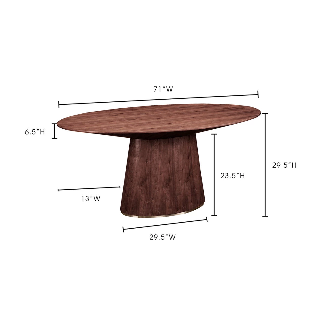Nestled on a walnut pedestal, this oval dining table has clean contemporary lines and brushed stainless steel detailing.