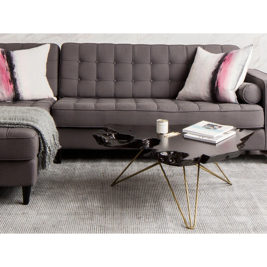 A solid teak surface with a dark brown finish and cherry undertones will warm up your space. Gold-brushed legs give this coffee table its contemporary flair.