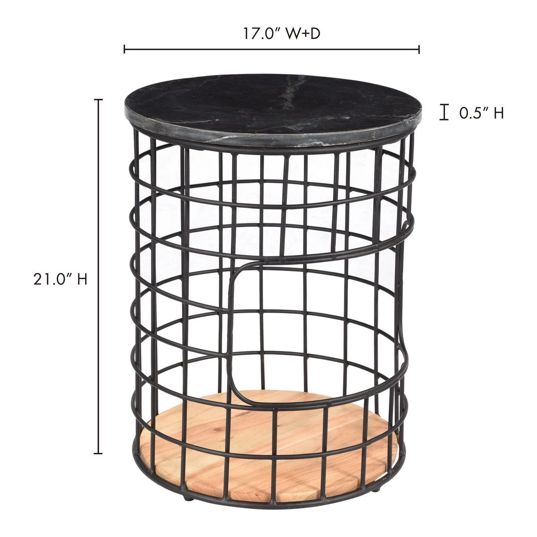 The Terrene side table offers sleek industrial design. A black industrial cage supports contrasting marble, making it a lowkey statement piece.