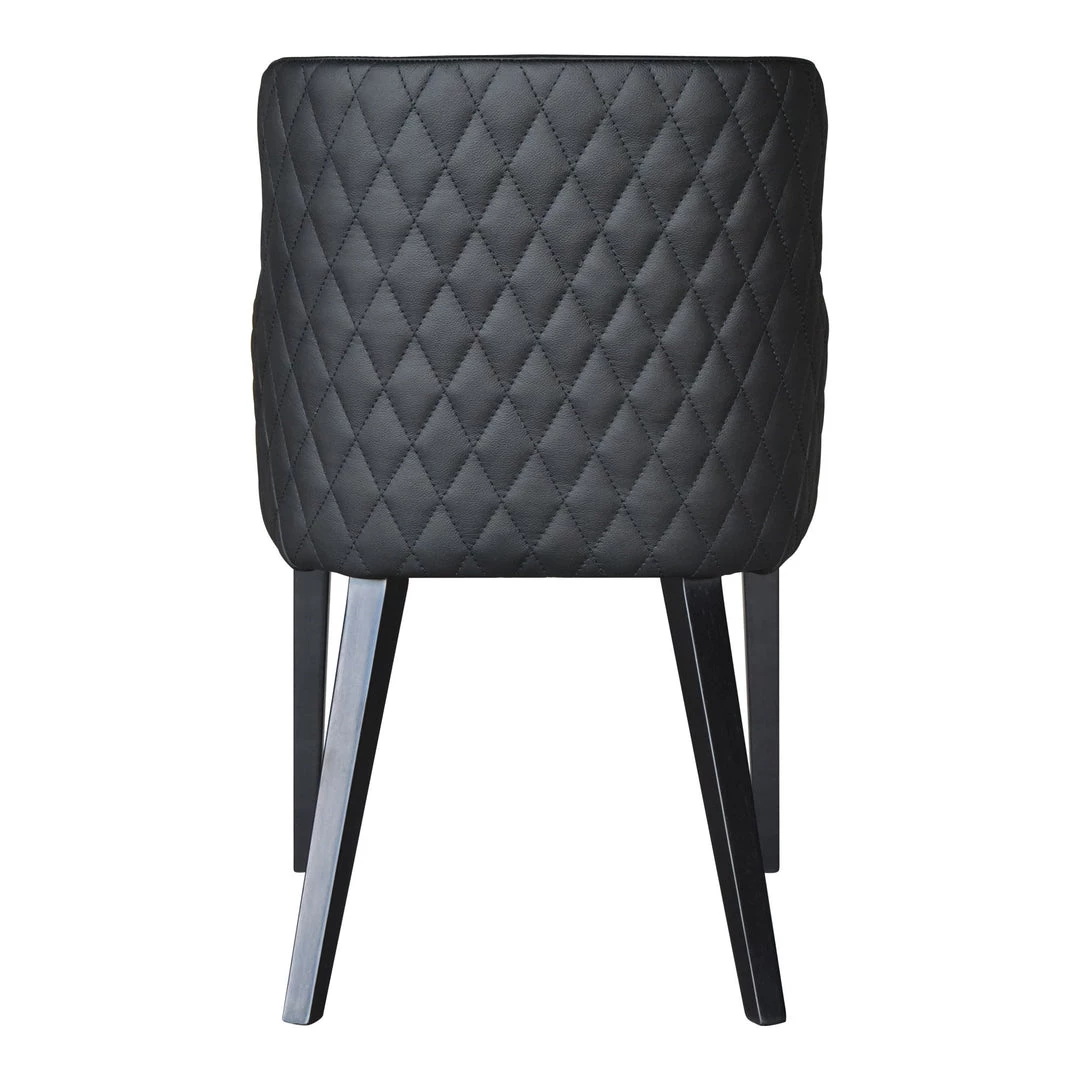 The Zayden dining chair features beautiful form with its sloped armrests, flared back legs, stately black top-grain leather, and a backside that features tufted stitch detailing.