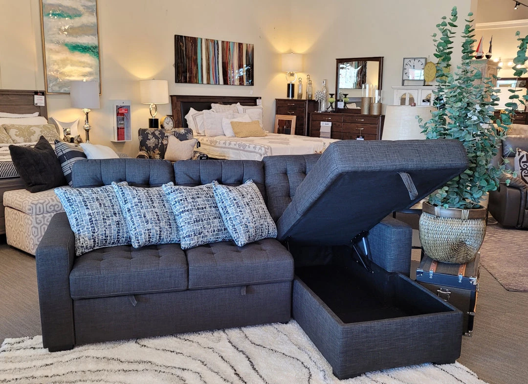 This compact sectional offers storage in the chaise and a pullout sleeping surface. Perfect for condos or any rumpus room. Available in both left or right-facing configurations, so it will be the Perfect Fit for any space.