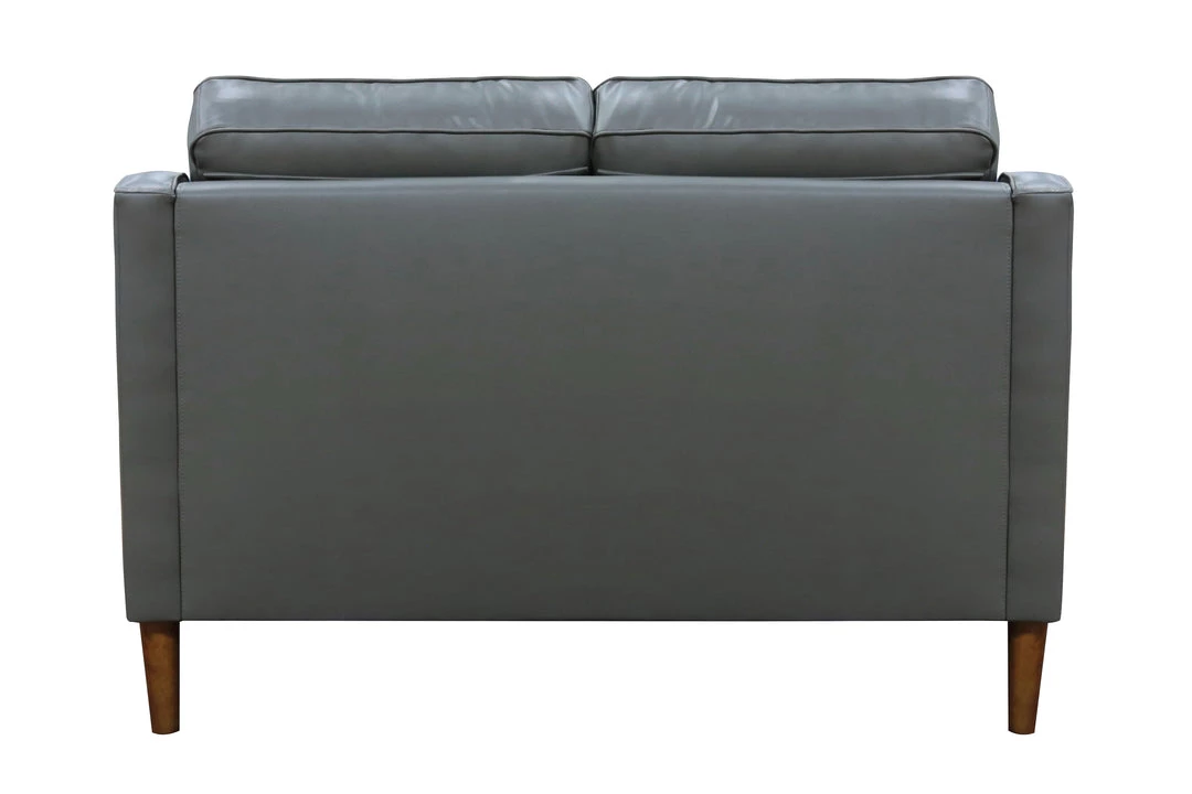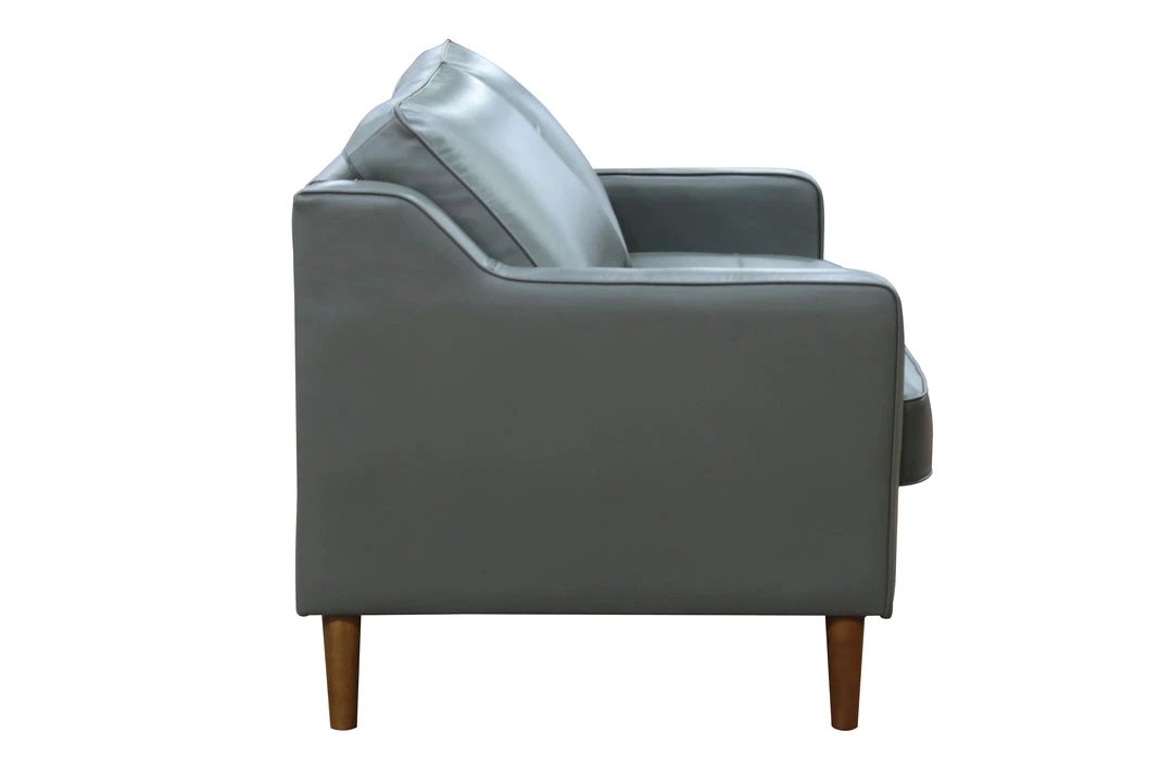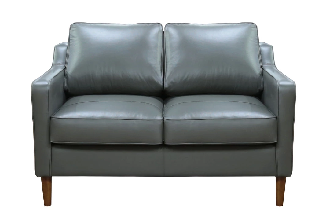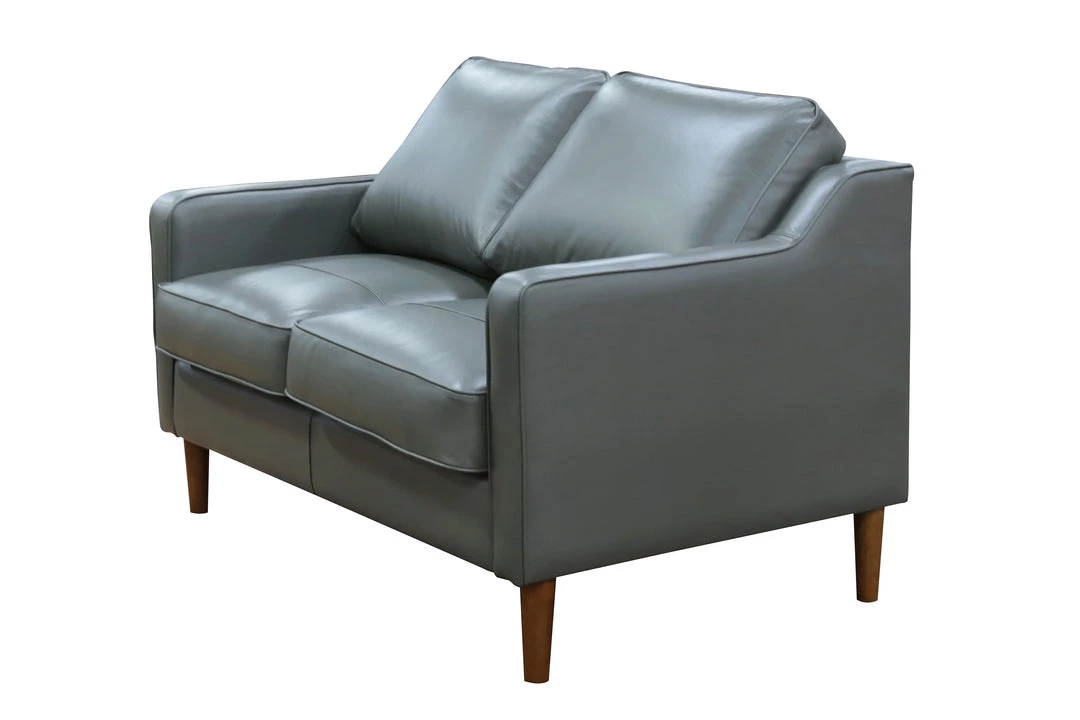 This high-leg loveseat is beautifully tailored in a neutral stone grey leather. The sloped arm adds visual interest while maintaining a minimalist look.