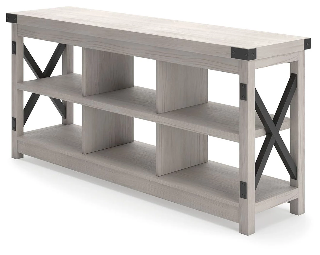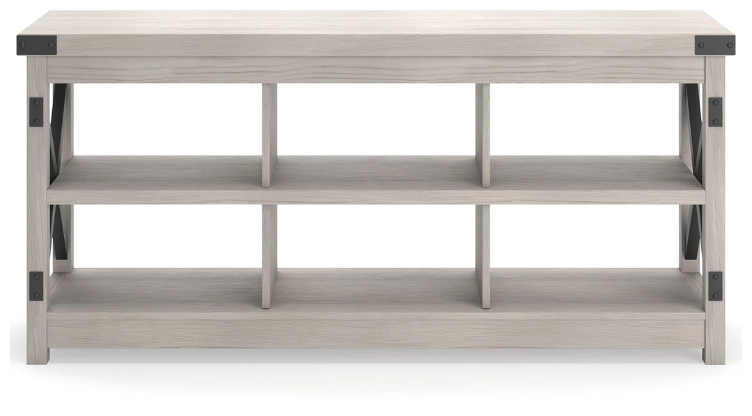 With its whitewash finish and six open storage areas, this TV stand offers a transitional style that fits everywhere from urban chic to modern farmhouse settings. Crossbuck elements on each end in a contrasting black accent color add simple charm.