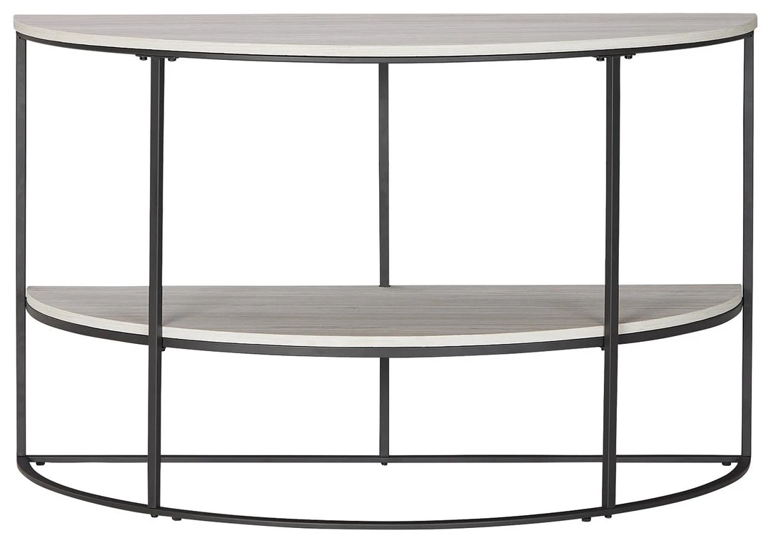 Entertain with ease with this casual, contemporary sofa table. Designed for the modern tastemaker, the minimalist design wows with metal legs and a laminated surface with a whitewashed effect. A lower display shelf provides ample space for books and baskets, or for showcasing your special decor accessories.