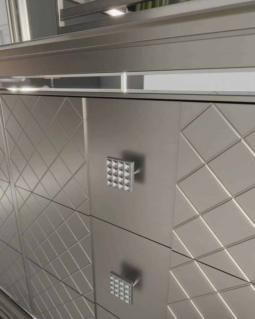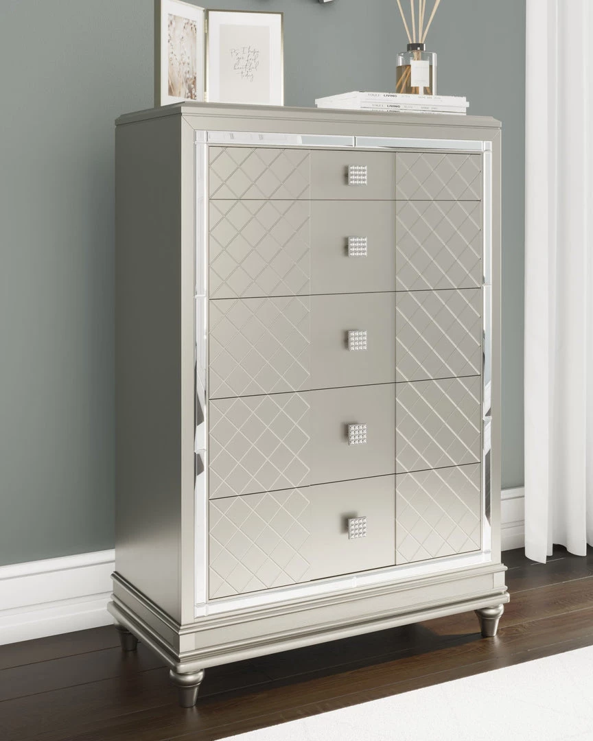 Contemporary Luxe design. Constructed with a combination of solid wood components, engineered wood substrate and engineered wood veneer. Platinum color finish with a beautiful high sheen luster. Cases and bed panels are accented with an embossed checkered pattern and beveled mirror trim. Well proportioned cases feature sanded and sealed drawer boxes with dovetail construction and ball bearing side glides. Custom designed drawer pulls with inset faux crystals. Upper drawers of each case feature felt lined bottoms. Night stand includes a 110V power supply with dual USB charging ports. Stylish bed design with arched headboard shape is accentuated with channeled upholstered panels that are back-lit with LED lighting. Velvety soft polyester fabric in a neutral light cream coloration.