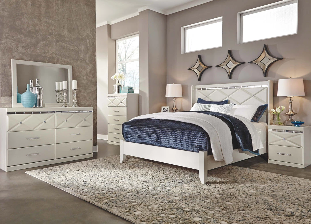 Champagne pearl stipple texture 3D pressed top case drawers. Diamond pattern shaped top drawers in a champagne stipple finish uses 3D press technology. Beveled mirror accent under moulding on case tops. Dazzling faux crystal accented handles and knobs. Champagne pearl stipple texture 3D pressed headboard panel with faux crystal buttons. Side roller glides for smooth operating drawers. Slim profile dual USB charger for the back of the night stand tops. Queen (57), king (58) panel headboards can attach to a bolt-on metal bed B100-31 or B100-66 respectively. Safety is a top priority, clothing storage units are designed to meet the most current standard for stability, ASTM F 2057 (ASTM International). Drawers extend out to accommodate maximum access to drawer interior while maintaining safety.