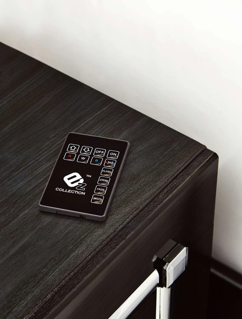 Textured faux black gator finish on case fronts, with replicated Walnut wood grain sides. Cases and bed are accented with faceted chrome details. Large scaled chrome handle with faceted details. Headboards are accented with LED lighting and include a remote for color and brightness options. Included remote holder discreetly keeps light remote accessible. Headboards are accented with faux crystal tufted black upholstery. Side roller glides for smooth operating drawers. Drawer interiors are lined with a faux linen laminate for a clean finished look. Both king and queen panel beds have a panel footboard (54,56) and storage footboard option (54S, 56S). Queen (57) and king (58) headboards can attach to a bolt-on metal bed B100-31 or B100-66 respectively. Queen (57) upholstered panel headboard is capable of attaching a full sized metal bolt on bed frame. Both USB and Qi wireless charging options are provided with the night stand. Safety is a top priority, clothing storage units are designed to meet the most current standard for stability, ASTM F 2057 (ASTM International). Drawers extend out to accommodate maximum access to drawer interior while maintaining safety.
