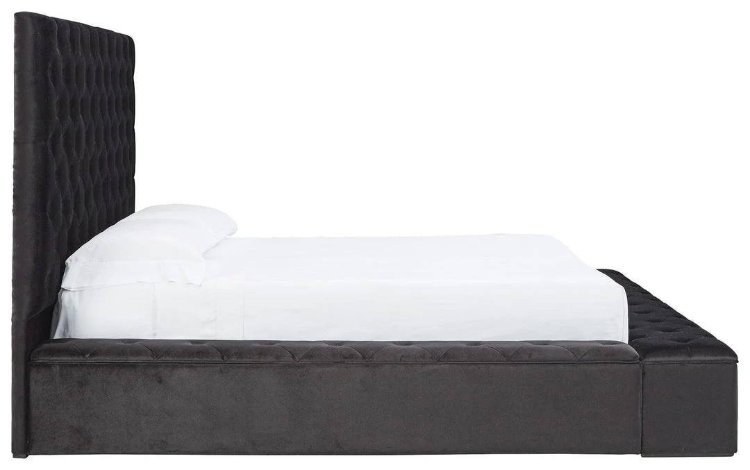 Achieve your high style aspirations with ease. This contemporary upholstered storage bed features a beautiful black velvet cover. A stylish space-saver, the footboard has a spacious storage box with fully lined interior bins. Additional storage is provided by side bins that are also fully lined. A delightful tufted design pulls things together to make this statement piece a must-have.