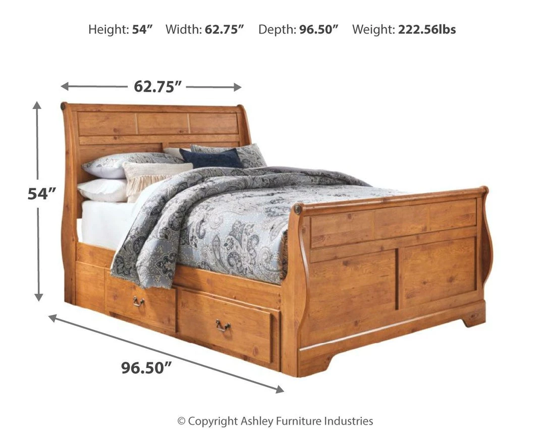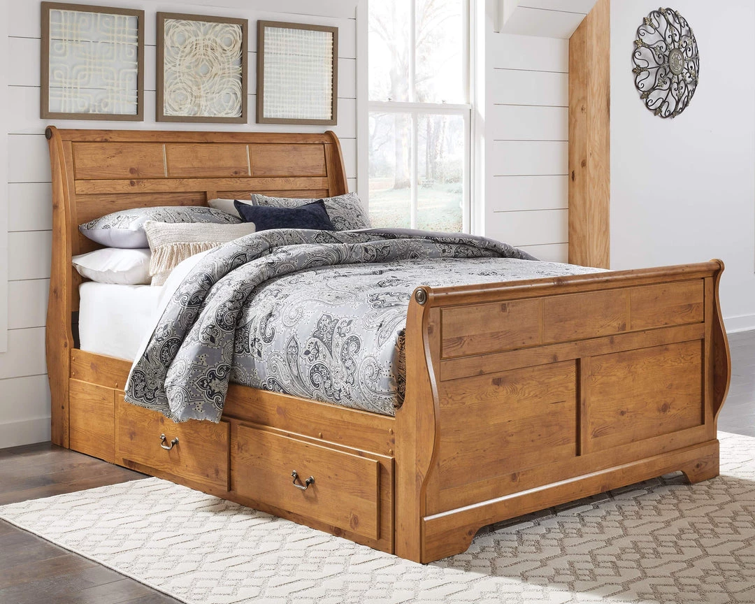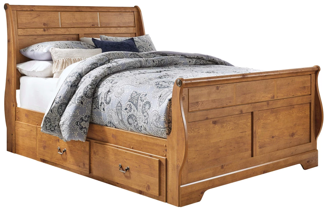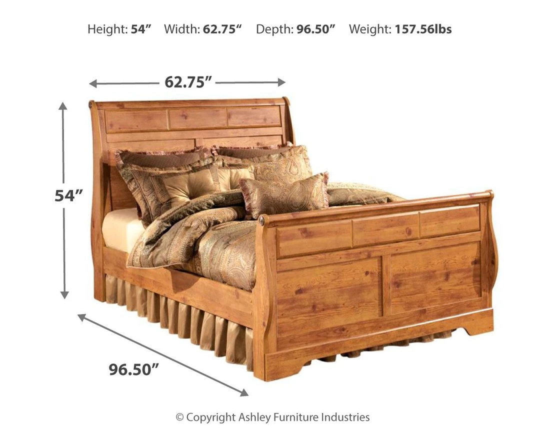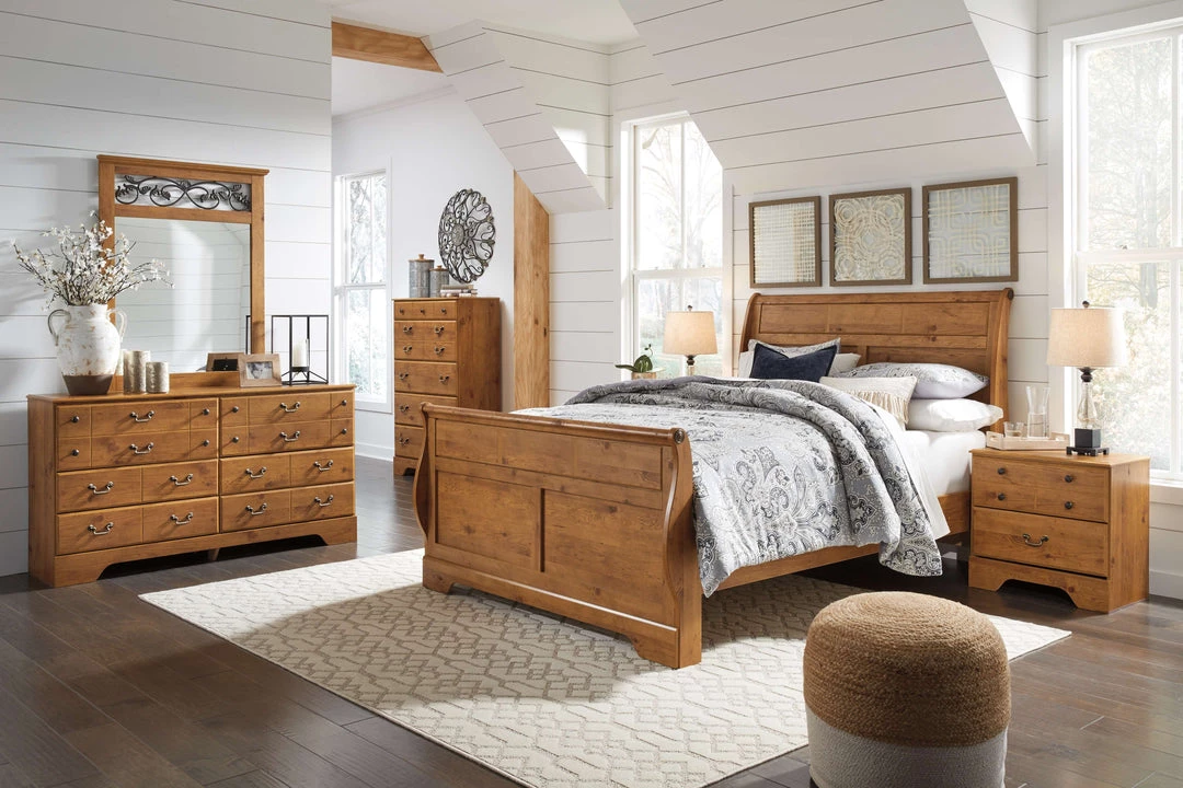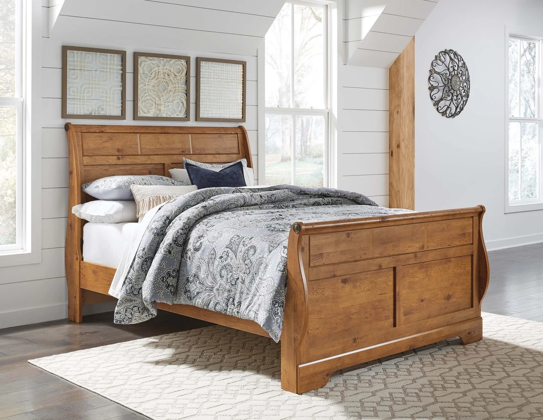 Replicated rustic pine grain. Antique color hardware with brass color highlights. Vine decorative inserts on headboard/footboard and mirror. Raised panels on headboard. Side roller glide case with non-snag drawer interiors. Sleigh Features: RTA. Mirror support provided. Queen (55), queen (65), and king (78) headboards can attach to a bolt-on metal bed frame B100-31 or B100-66 respectively. Queen (55) panel headboard is capable of attaching a full sized metal bolt on bed frame. Side roller glides for smooth operating drawers. Safety is a top priority, clothing storage units are designed to meet the most current standard for stability, ASTM F 2057 (ASTM International). Drawers extend out to accommodate maximum access to drawer interior while maintaining safety.