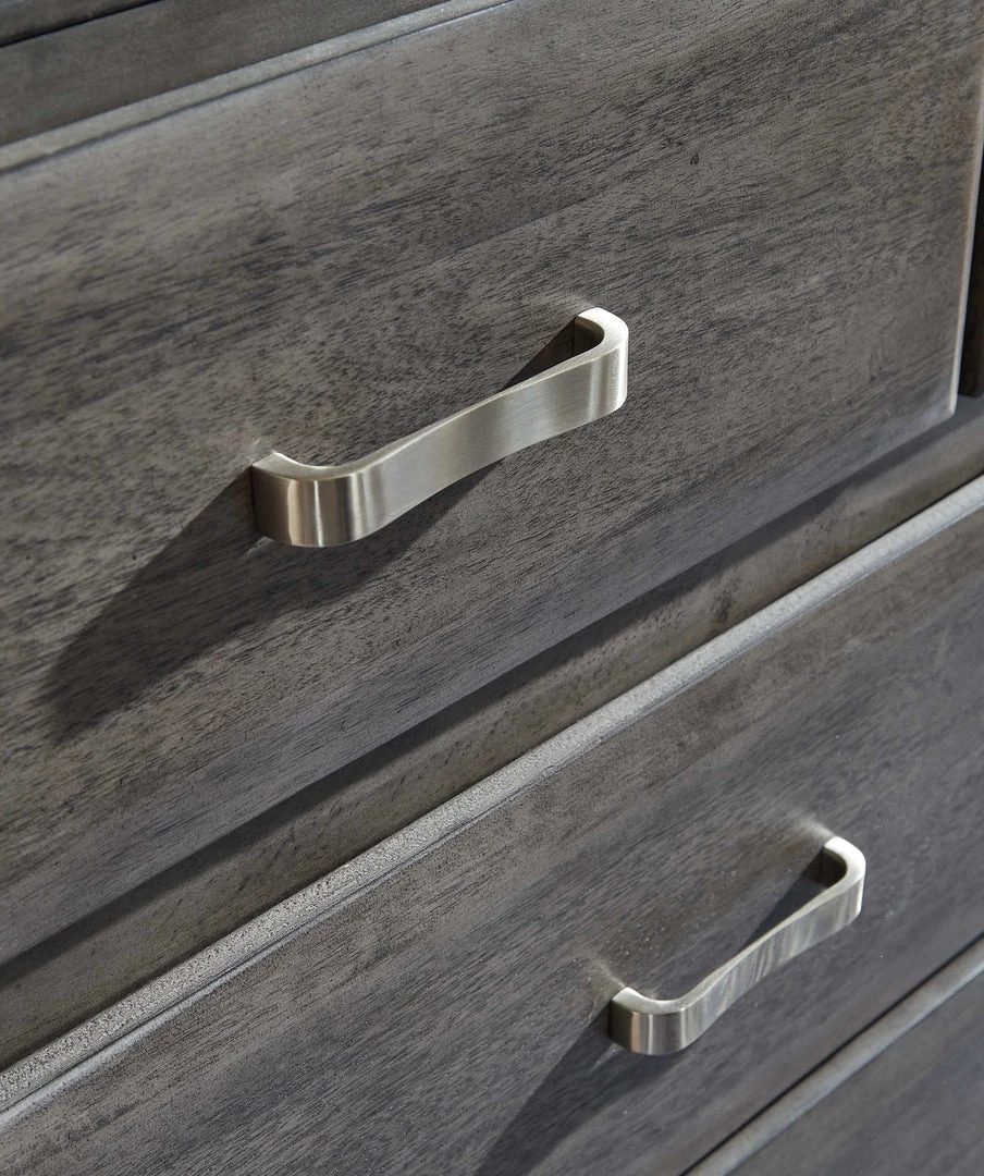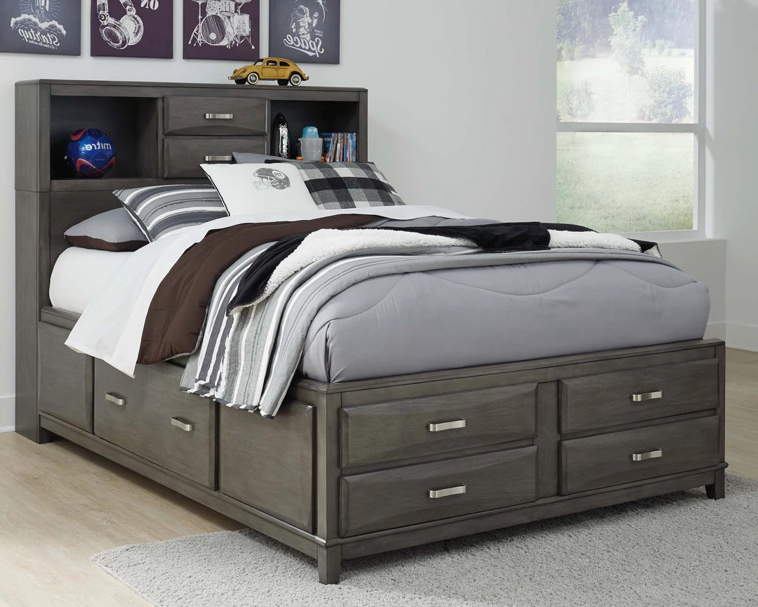 Casual contemporary design. Made with select wood solids, veneers and engineered wood. Contoured drawer fronts with pressed veneer face. Dovetail drawer construction with metal center guides. Stylish metal bar pulls. Captain’s style storage bed features a large assortment of drawer storage in the side rails, footboard and headboard. Note full size bed features storage on only one side rail.
