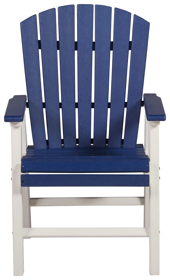 Pull up a chair on the back deck or poolside and gather around for good times. These two-tone outdoor dining chairs have sturdy legs in crisp white, with the arms, seat and back in a beautiful blue that matches the clear sky. A slatted seat and back allow drainage to prevent rainwater buildup. Designed to withstand harsh weather, this comfortably casual outdoor duo is made with durable MEGA TUFF™ HDPE material that won’t chip, rust or peel.