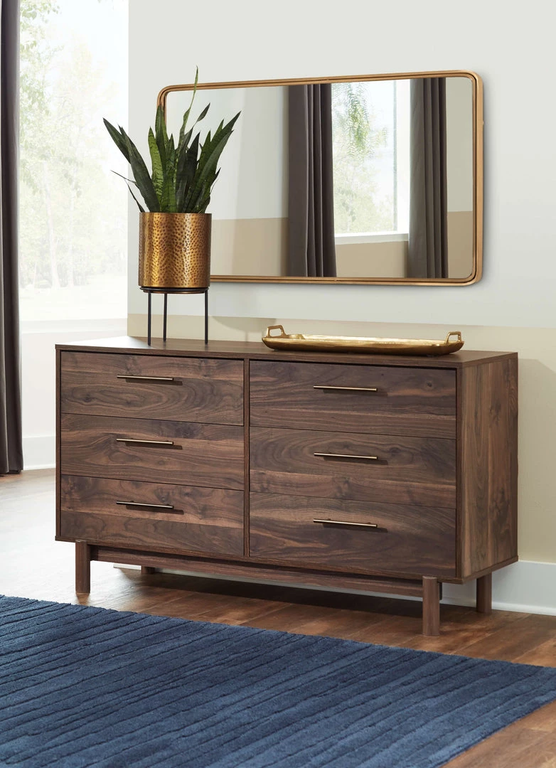 At the intersection of industrial cool and chic sophistication you’ll find this dresser. The rich brown finish over replicated walnut wood grain and burnished goldtone handles offer an authentic touch that plays well any way you style it. Simple and elegant in its design, this piece keeps your home decor grounded while elevating your modern style.