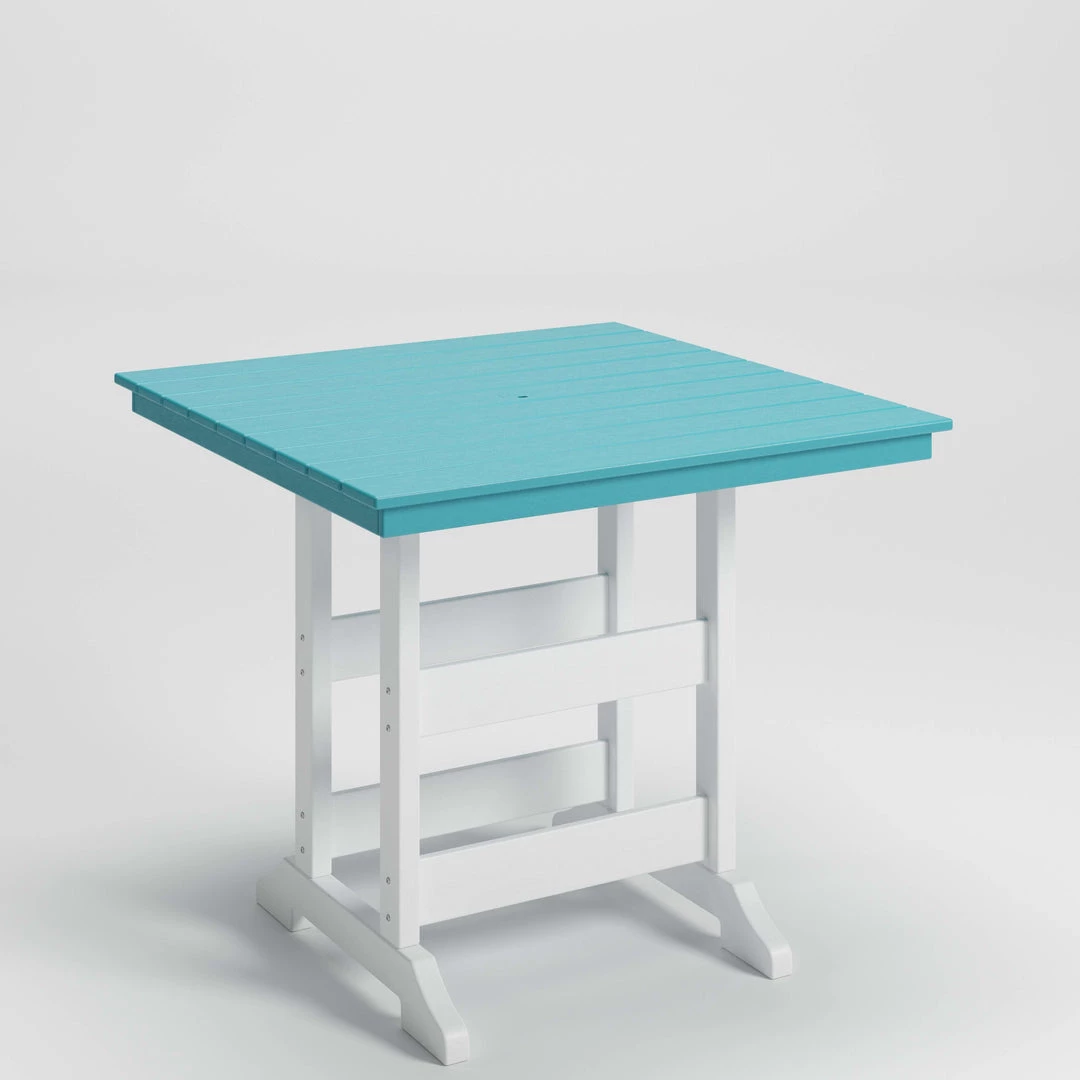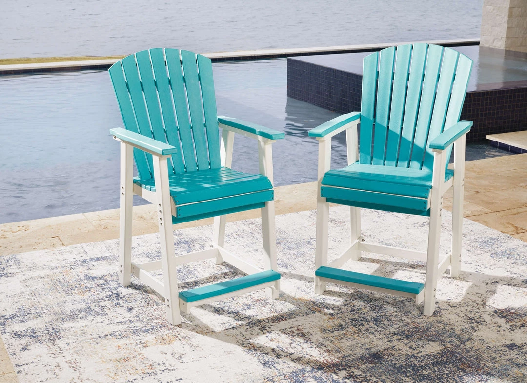 Raise the bar on outdoor living with this collection. Crafted for style and durability, it caters with a standout two-tone look that pairs a light turquoise and white for twice the interest. The table’s counter height design elevates the aesthetic. The counter height barstools have sturdy armrests, an ample footrest, a high shell back and a waterfall wrapped seat for curvaceous comfort. An Umbrella hole lets you throw some shade on your outdoor living space.