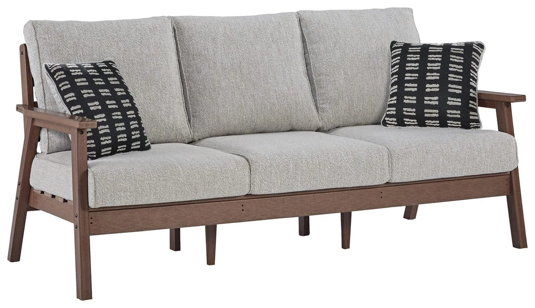 Get back to nature with the relaxed styling of this outdoor sofa with cushions. Crafted of MEGA TUFF™ HDPE material, it combines the exceptional durability and weather resistance you need with the “wood look” you love. Rest assured, the cushions are wrapped in comfortable and carefree Nuvella® fabric, leaving you plenty of time to sit back and smell the roses.