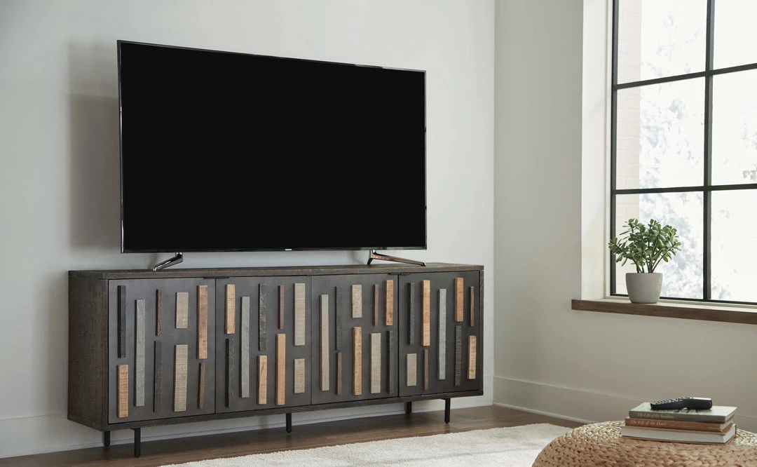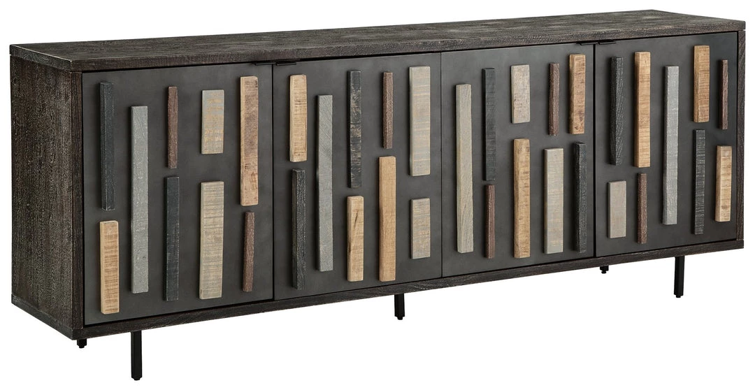 Elevate your contemporary home to a haven with an undeniably artistic attitude. This accent cabinet has a forward-thinking flair, featuring a modern mosaic created by strips of wood in varying hues against a dark brown and metallic gray finish. Fashionable and functional, the detailed doors open to reveal two shelves to suit all your storage needs.
