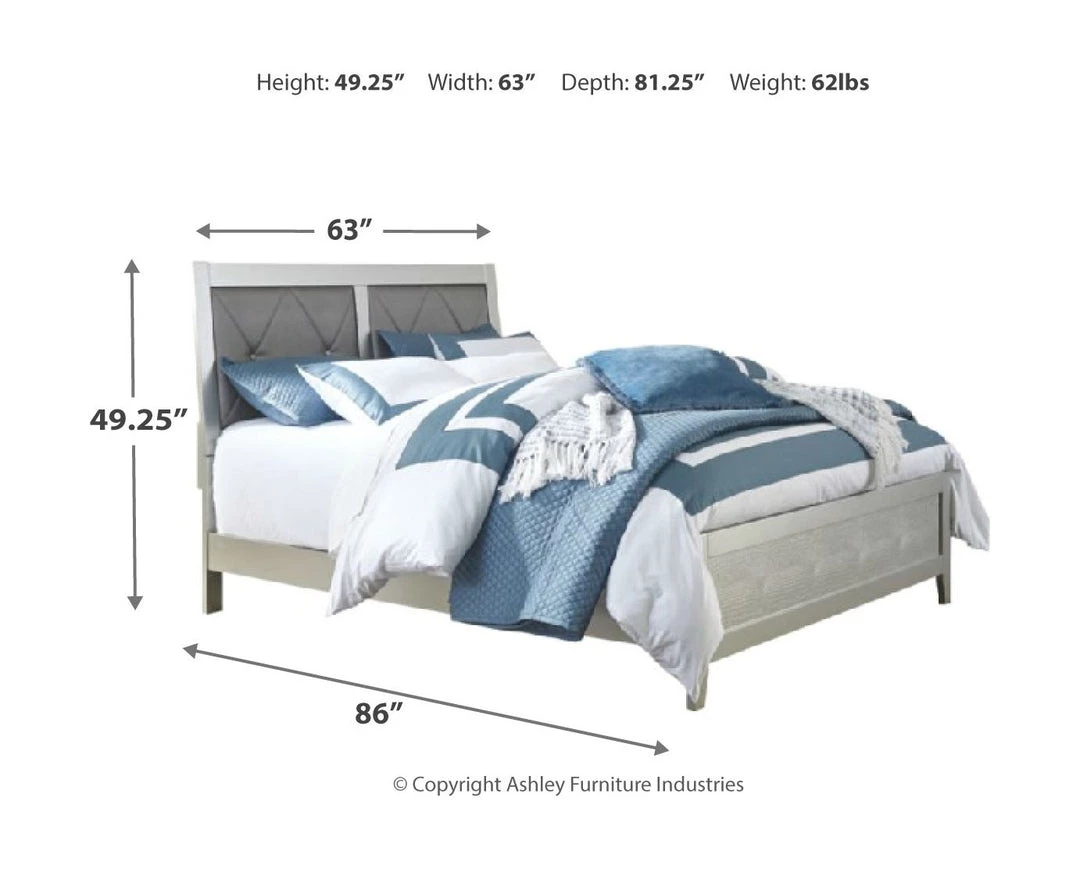 Made with paint grade materials and hardwood solids finished with a metallic silver color. Embossed textural drawer fronts and footboard panel have a modern “Glam” look. Headboard panel features diamond tufted gray faux leather cover with crystal look buttons. Metal center guide drawers with paper wrapped boxes. Bar pulls with inset faux crystal arrangement. Mirror has decorative upholstered insert with gray faux leather cover. Twin and full panel bed is made with paint grade materials and hardwood solids finished with a metallic silver color. Footboard has embossed textural panel within a simple frame and tapered leg. Headboard panel features diamond tufted gray faux leather cover with crystal look buttons. Fully upholstered bed is offered in twin and full sizes and has box stitching and shallow tufting effect with crystal look buttons and delivers in one box.