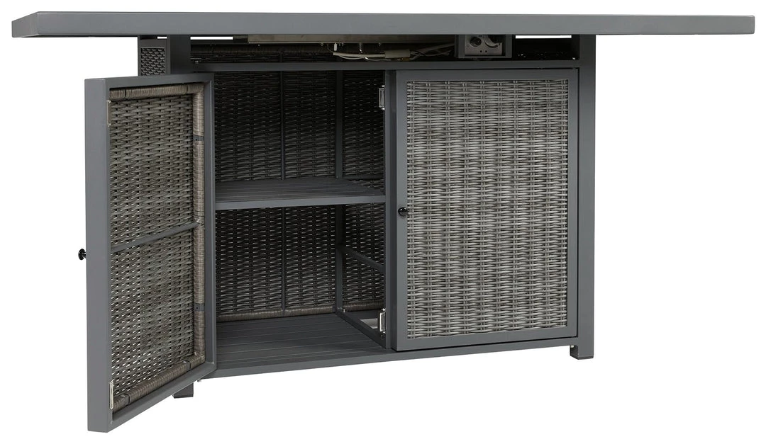 Turn your backyard into a hotspot for entertaining with this bar table with fire pit. Sporting a neutral gray finish, the rectangular table elevates the art of al fresco living. Its chic aluminum frame is paired with all-weather resin wicker for beauty and brawn. This outdoor table is enhanced with glass beads that add a dramatic element. Hidden storage shelves and a protective weather cover keep everything ready and waiting for impromptu entertaining.