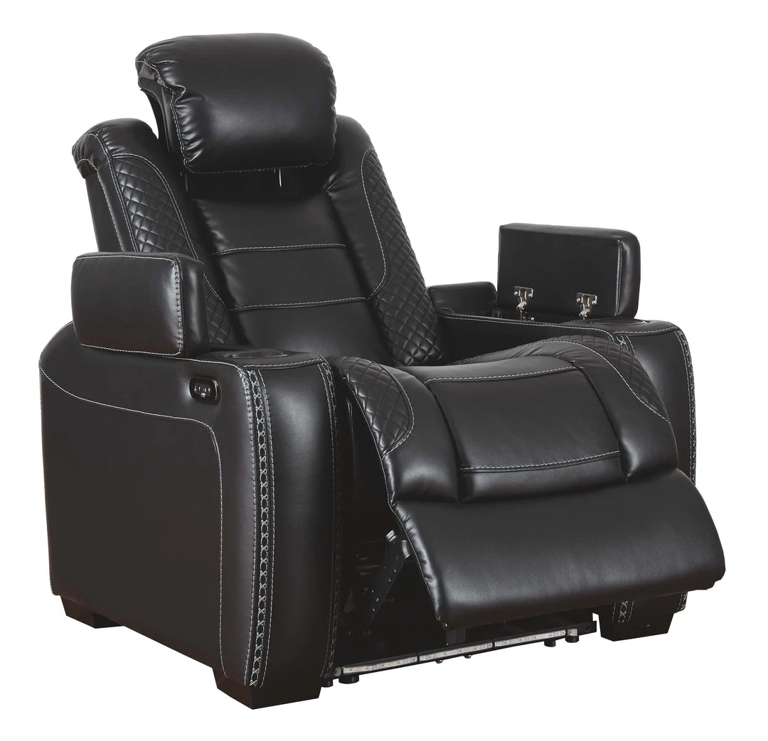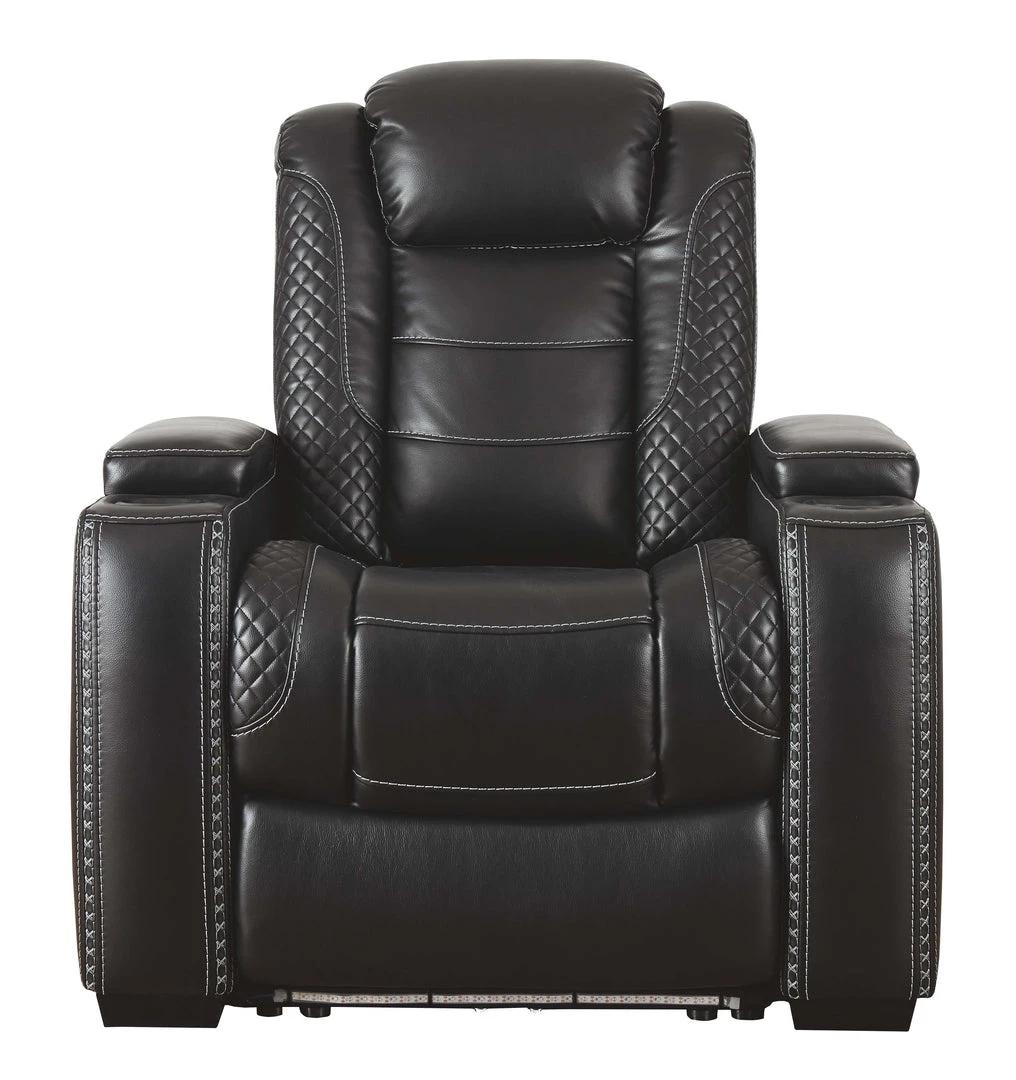 This power recliner takes its cue from luxury automobiles with lattice- and cross-hatch stitching, for a richly tailored aesthetic that gives you plenty of reasons to celebrate. Sumptuously padded cushions and dramatic midnight black faux leather upholstery add to the indulgence. When it’s time to rev up the action, the recliner’s reclining bucket seat, Easy View™ power adjustable headrest, LED accent lighting and USB charging port keep you in the driver’s seat.