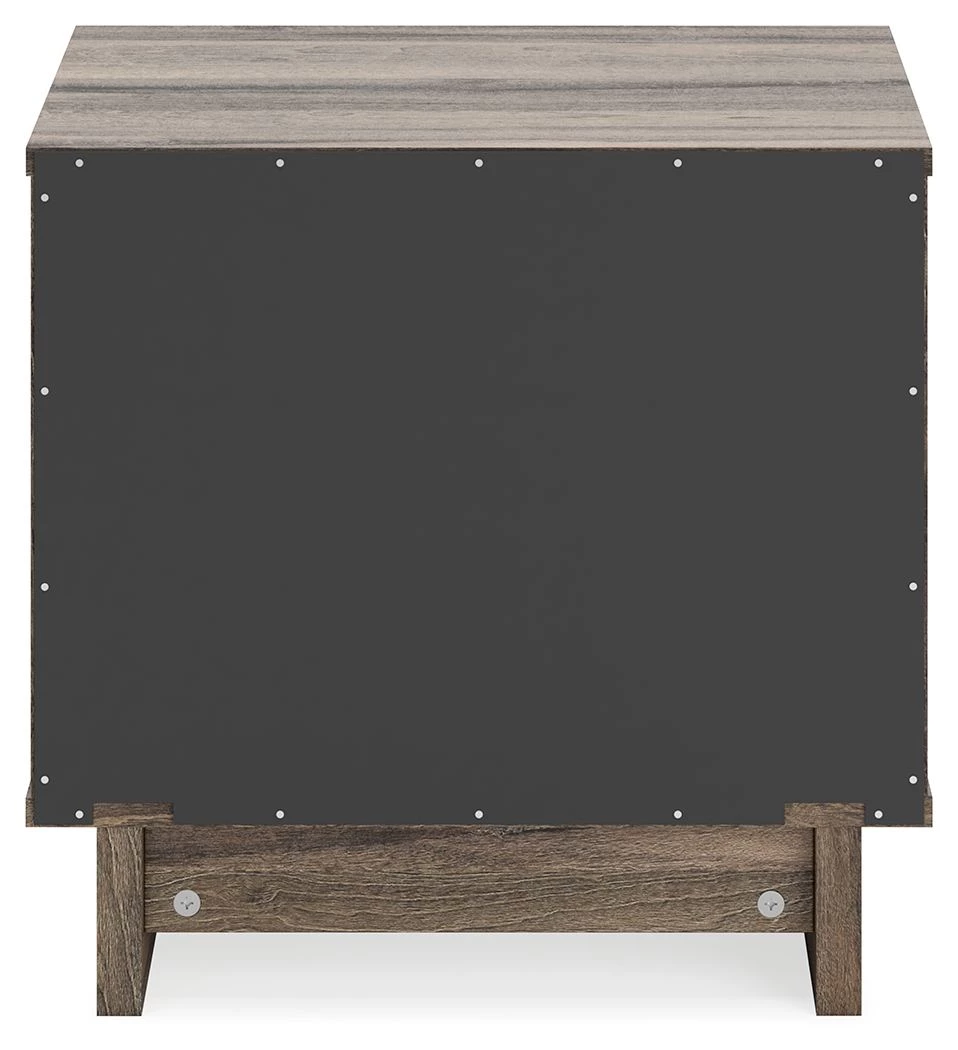 Your modern sanctuary is within reach. The subtle design of this nightstand is accented with a low profile base. Its weathered brown finish is complemented with refined champagne-colored handles on the smooth-gliding drawers. An open shelf provides additional bedside storage.