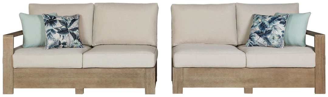 Eucalyptus cushioned wood sectional with Nuvella high performance fabric. P804-854/877 includes 6 throw pillows. Assembly required.