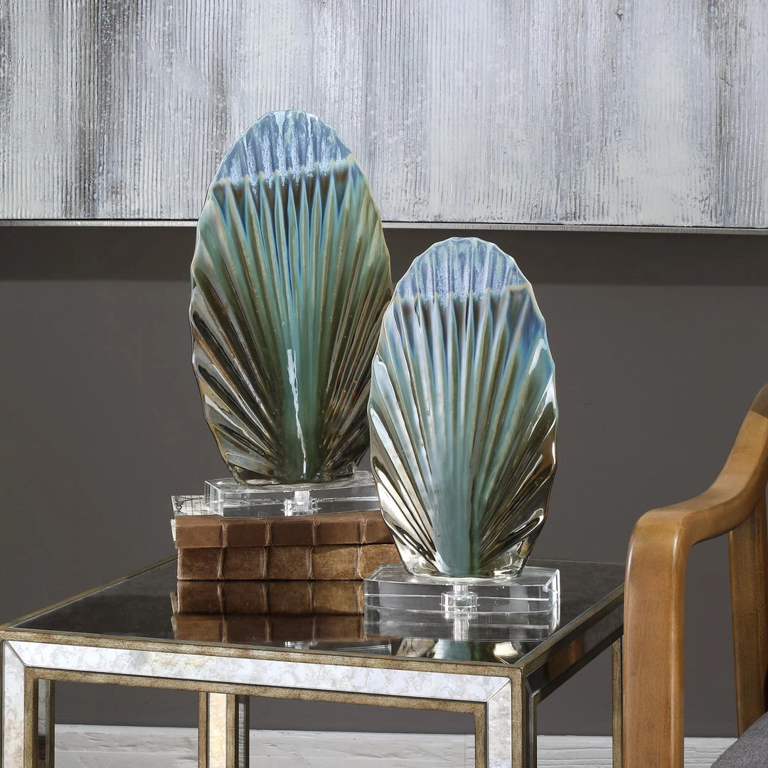 Reactive Glazed Ceramic Fan Sculptures, Comprised Of Blues, Greens And Bronze, Set On Tonneau-shaped Crystal Bases.Sizes: Sm-7x13x4, Lg-8x16x4