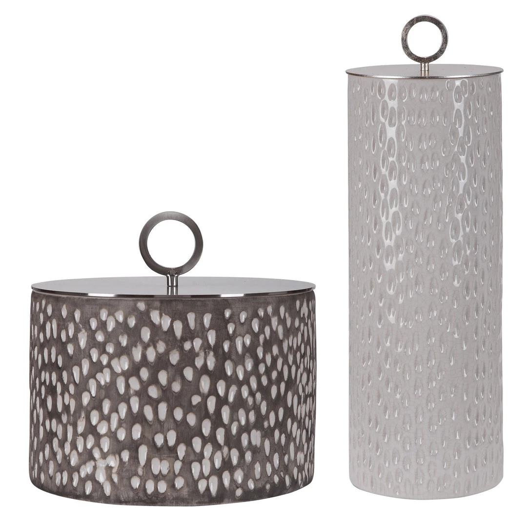 Ceramic Containers Feature Carved Detailing And Are Finished In Off-white And Smoke Gray Crackle Glazes With Respective Aged Gold And Brushed Nickel Finished Lids. Sizes: S-9x9x9, L-6x19x6