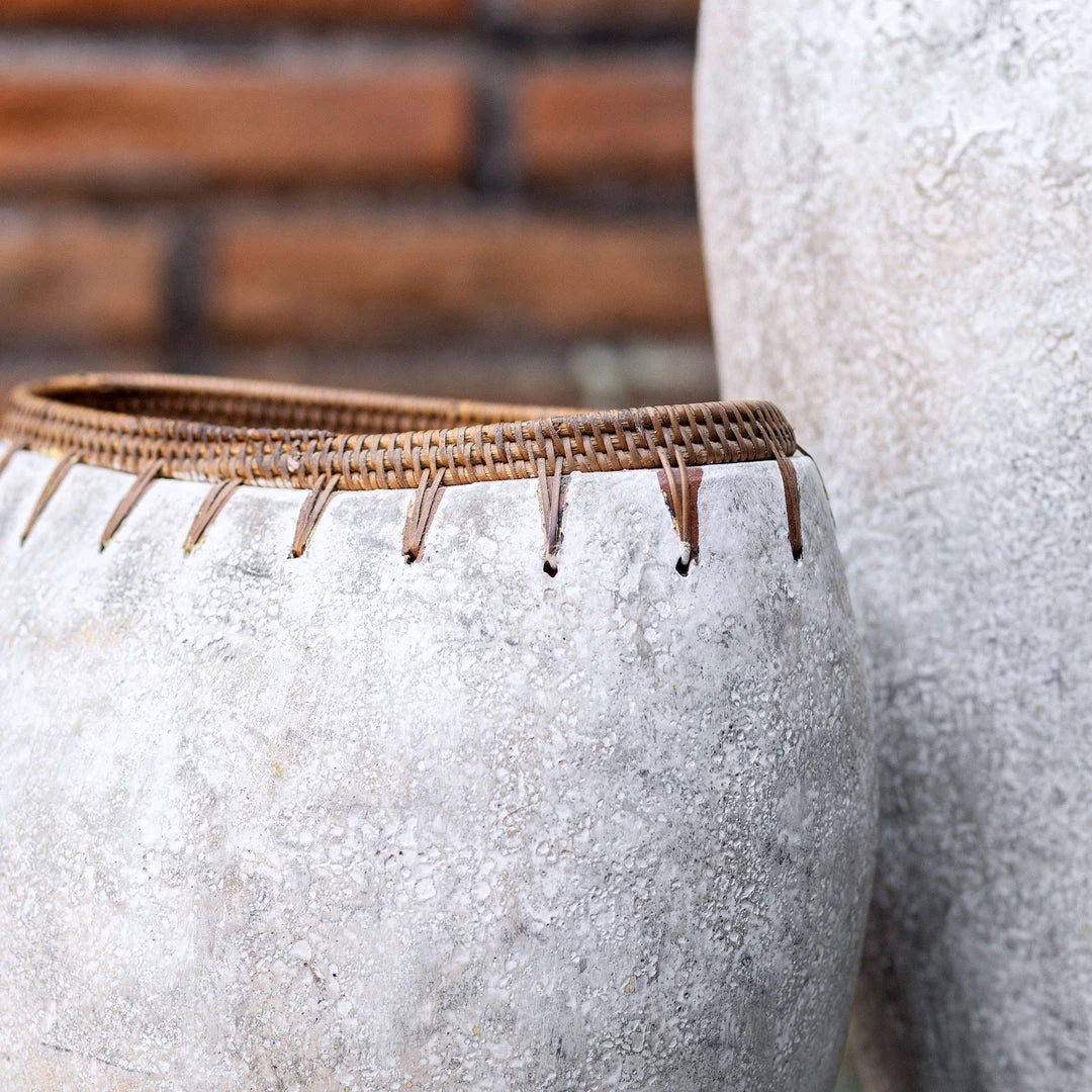 Set Of Two Terracotta Vases Are Finished In A Natural Stone Look With Noticeable Texture And Braided Rattan Accents.