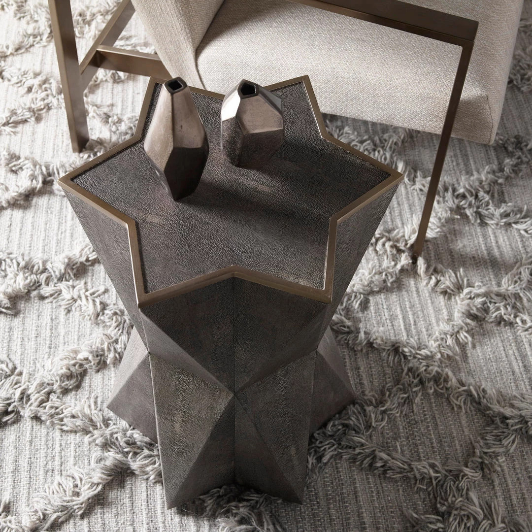 Unique Star Shaped Accent Table Features A Charcoal Gray Faux Shagreen Wrap, Accented With A Hand Applied Gold Leaf Trim.