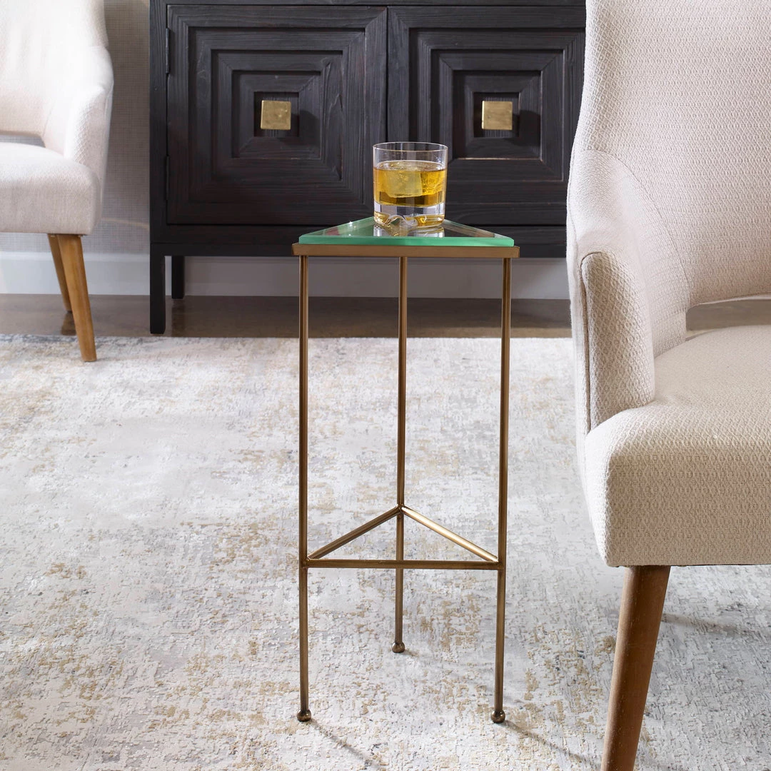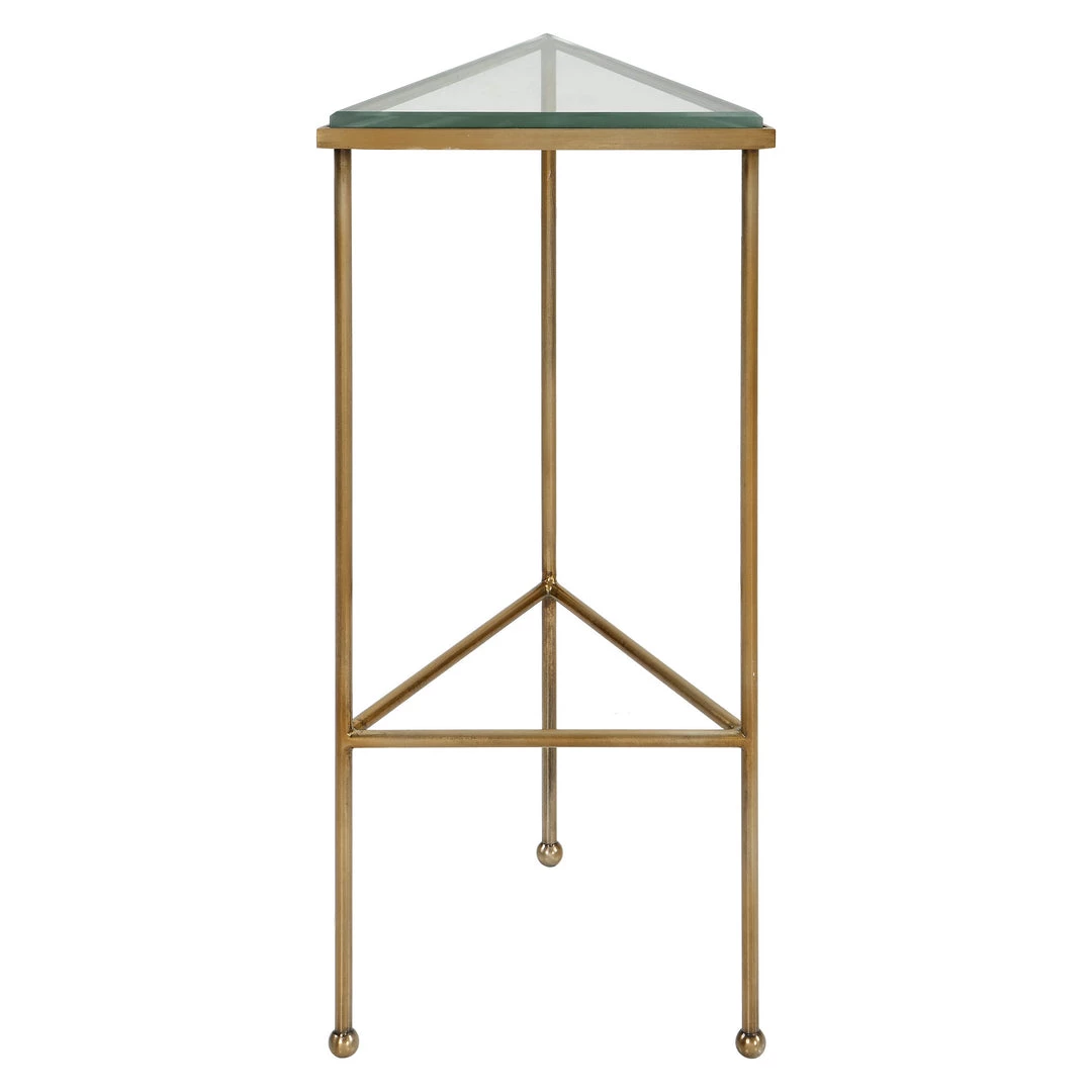 This Quirky Triangular Drink Table Features A Sturdy Iron Frame, Finished In A Sophisticated Brushed Gold With A Thick Glass Top. Perfect For Displaying A Cocktail Or Your Favorite Book.