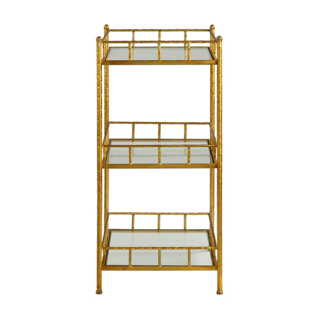Add A Touch Of Glam With This Accent Piece Featuring Caged Tray Style Shelves With Hammered Texturing Finished In Bright Gold Leaf. Shelves Are Clear Glass.