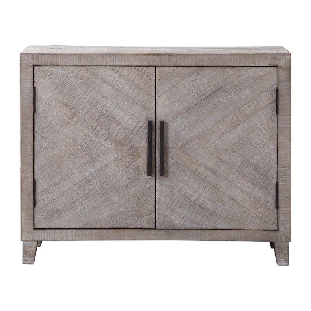 This Modern Farmhouse Two Door Cabinet Features Linear Textured Fir Wood, Finished In A White Washed Glaze With Oatmeal Undertones. Antique Bronze Iron Door Pulls Open To One Adjustable Shelf.