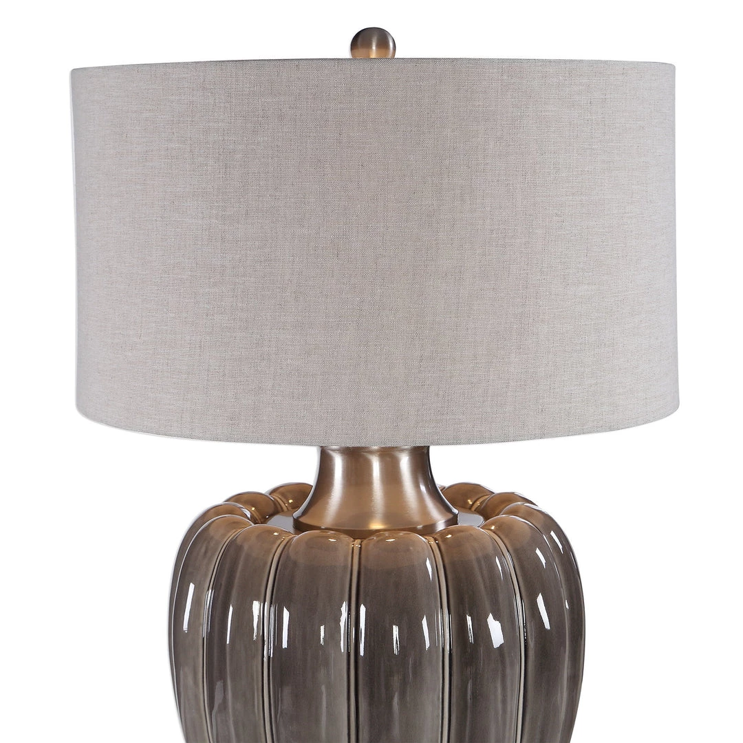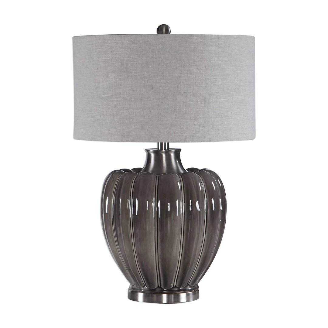 Contemporary Style Exudes From This Elegantly Shaped Ceramic Table Lamp Featuring Defined Ridges, Finished In A Smoky Gray Glaze, Accented With Brushed Nickel Plated Details. The Round Hardback Drum Shade Is A Light Beige Linen Fabric With Natural Slubbing.