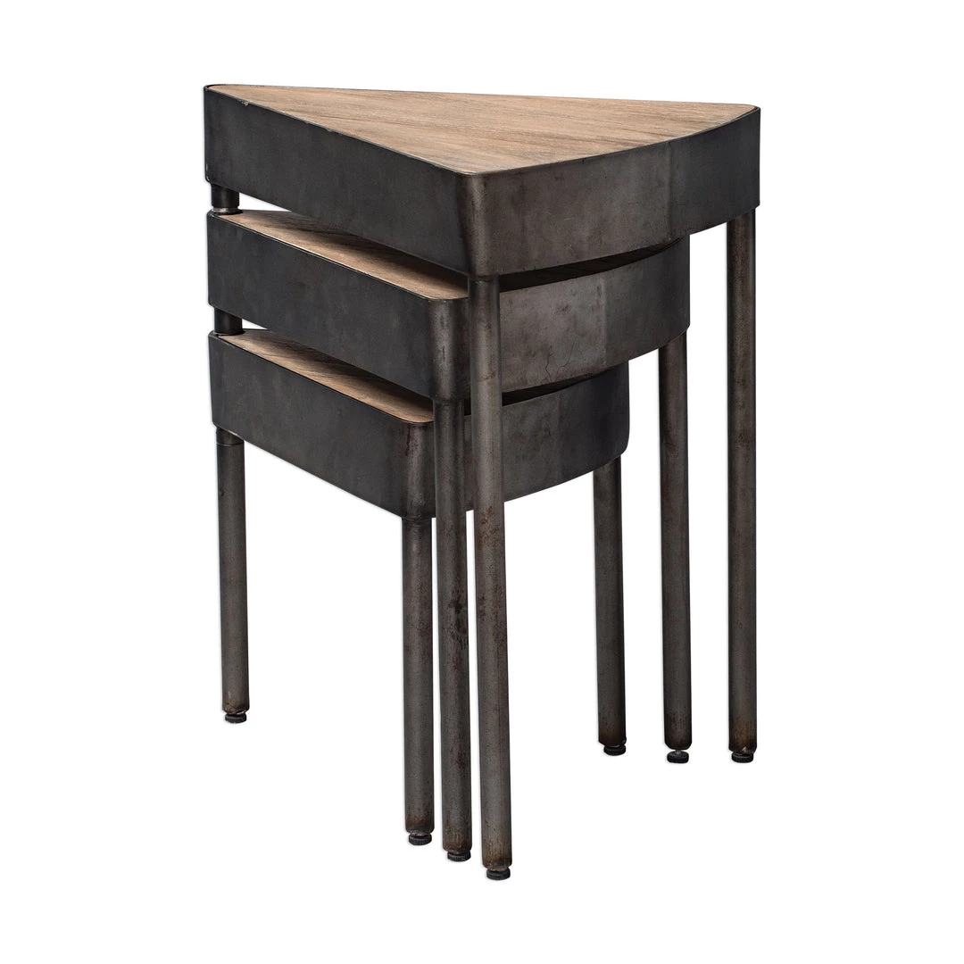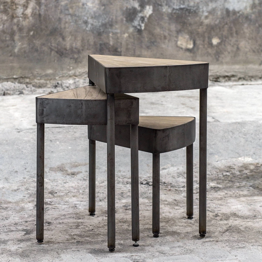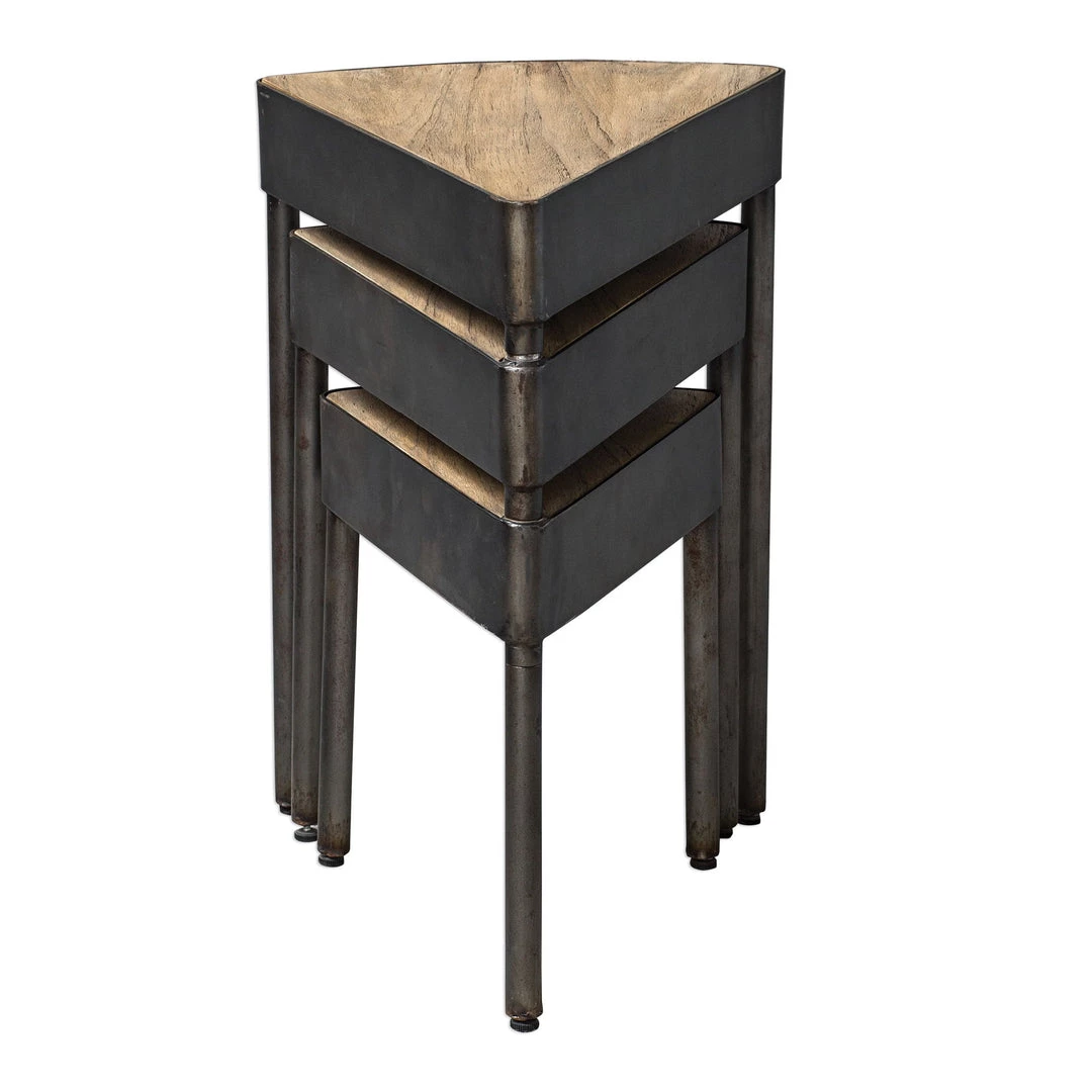 Featuring Versatile Functionality, This Contemporary Nesting Table Design Features Swivel Action Allowing You To Create The Shape With Three Tabletops. Mindi Veneer Tops Are Finished In A Natural Wheat With Thick Aged Steel Finished Supports. S- 12″x 15″x 15″, M- 14″x 19″x 17″, L- 16″x 24″x 20″