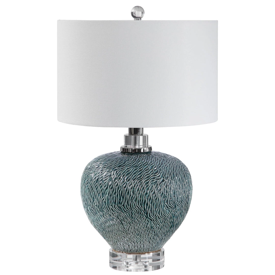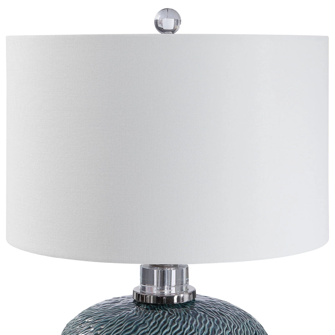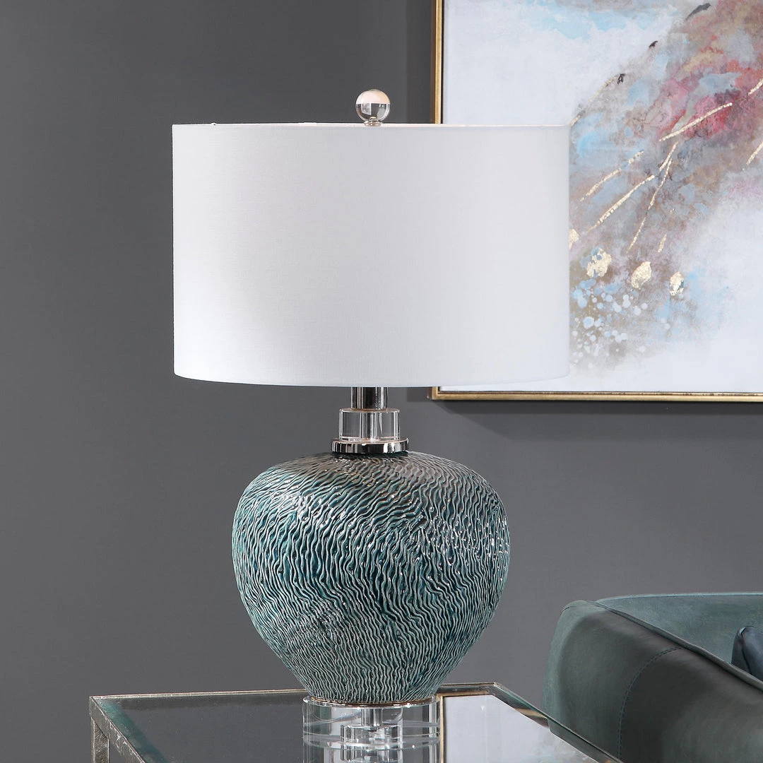 Add A Touch Of Bohemian Flair To A Space With This Unique Table Lamp. The Ceramic Base Features An Organic Textured Base Finished In A Distressed Dark Teal Glaze, Paired With Polished Nickel Accents And Thick Crystal Details. The Hardback Drum Shade Is White Linen Fabric. Due To The Nature Of Fired Glazes On Ceramic Lamps, Finishes Will Vary Slightly.