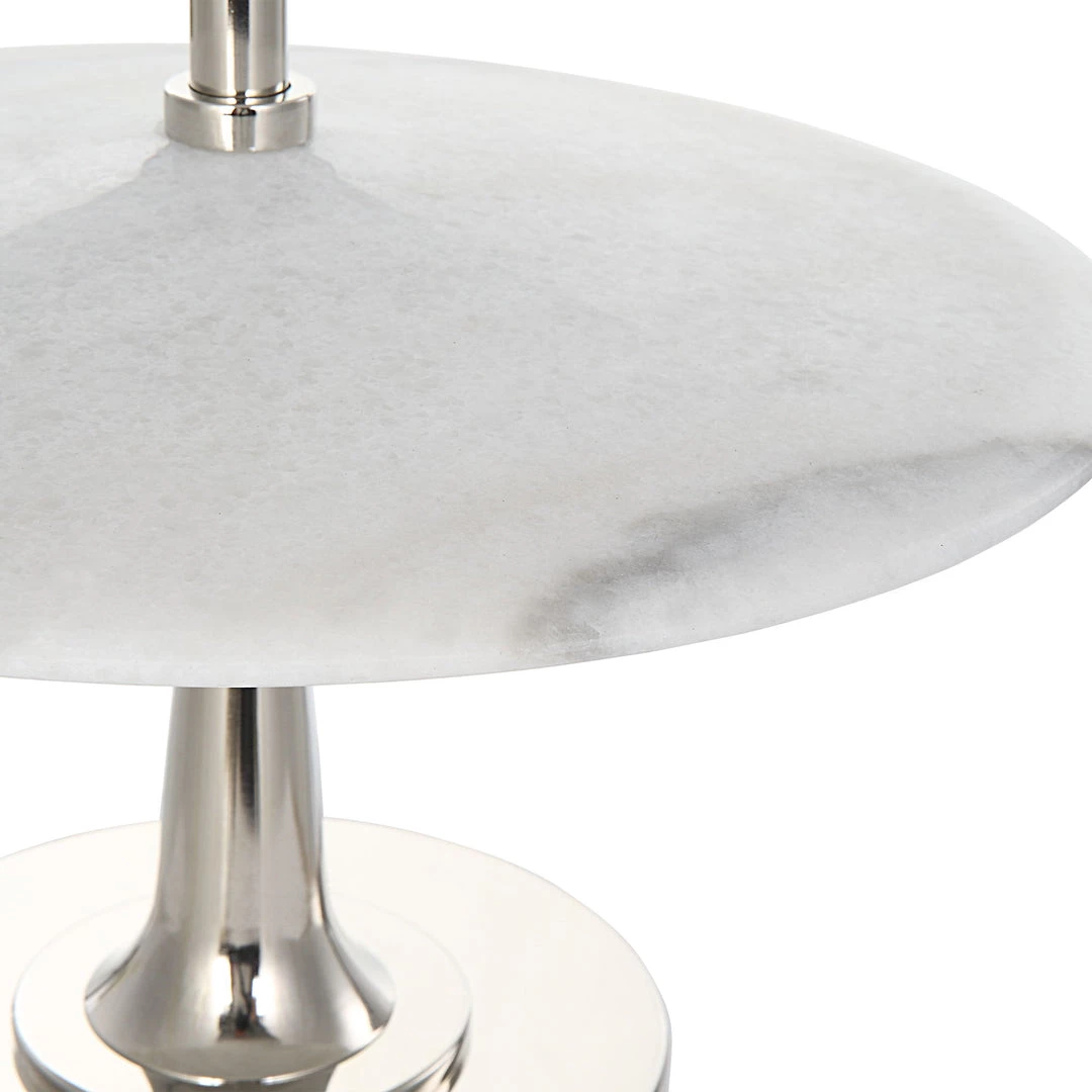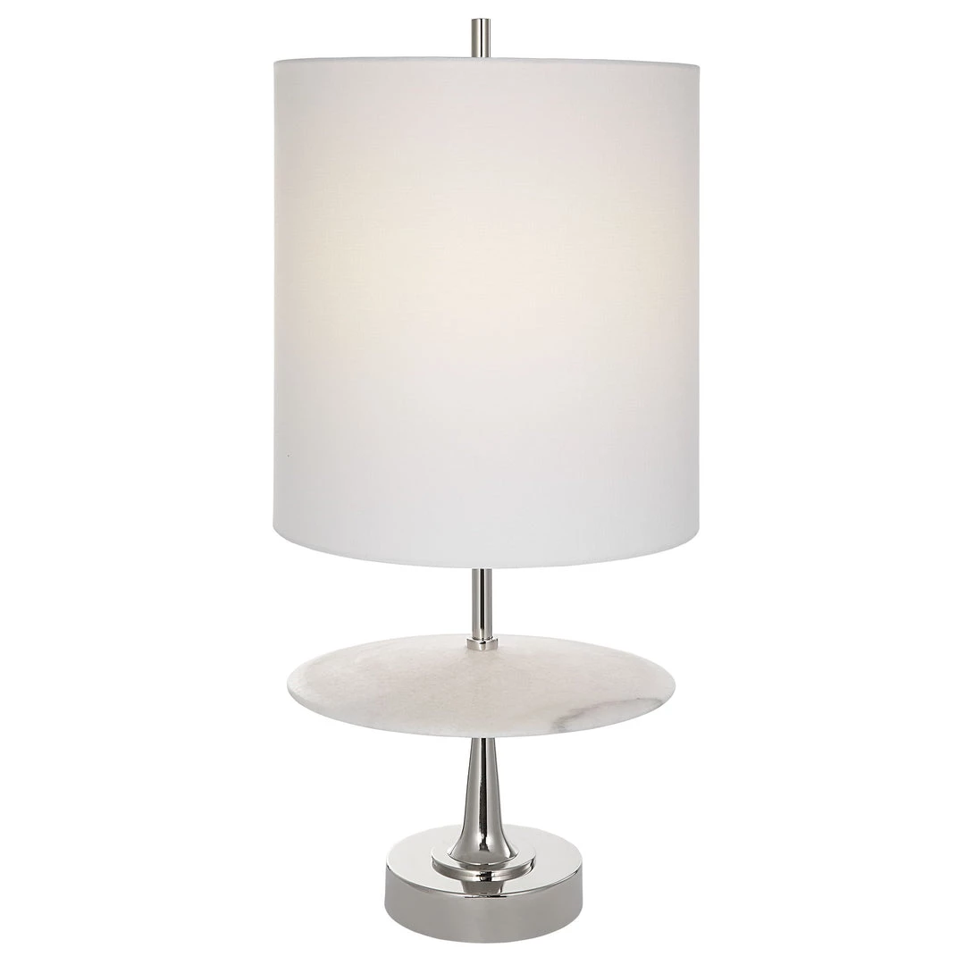 Displaying A Contemporary Feel, This Table Lamp Is Outfitted With A Polished White Marble Disk With Natural Gray Veining, Displayed Between Plated Polished Nickel, Tapered Iron Stand. A White Fabric Shade Completes The Piece.