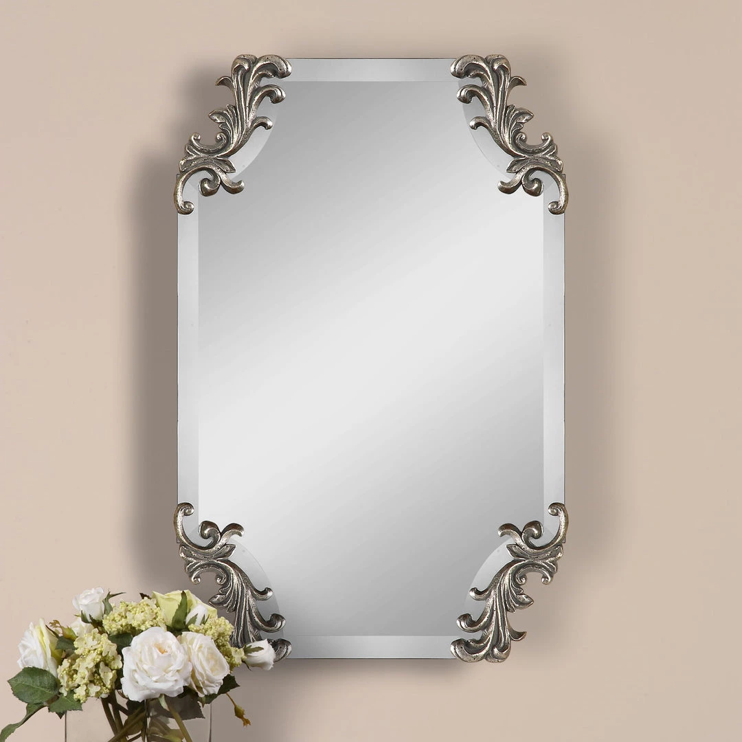 Frameless, Shaped Beveled Mirror Accented By Decorative Corner Ornaments Finished In Heavily Burnished Antiqued Silver. May Be Hung Either Horizontal Or Vertical.