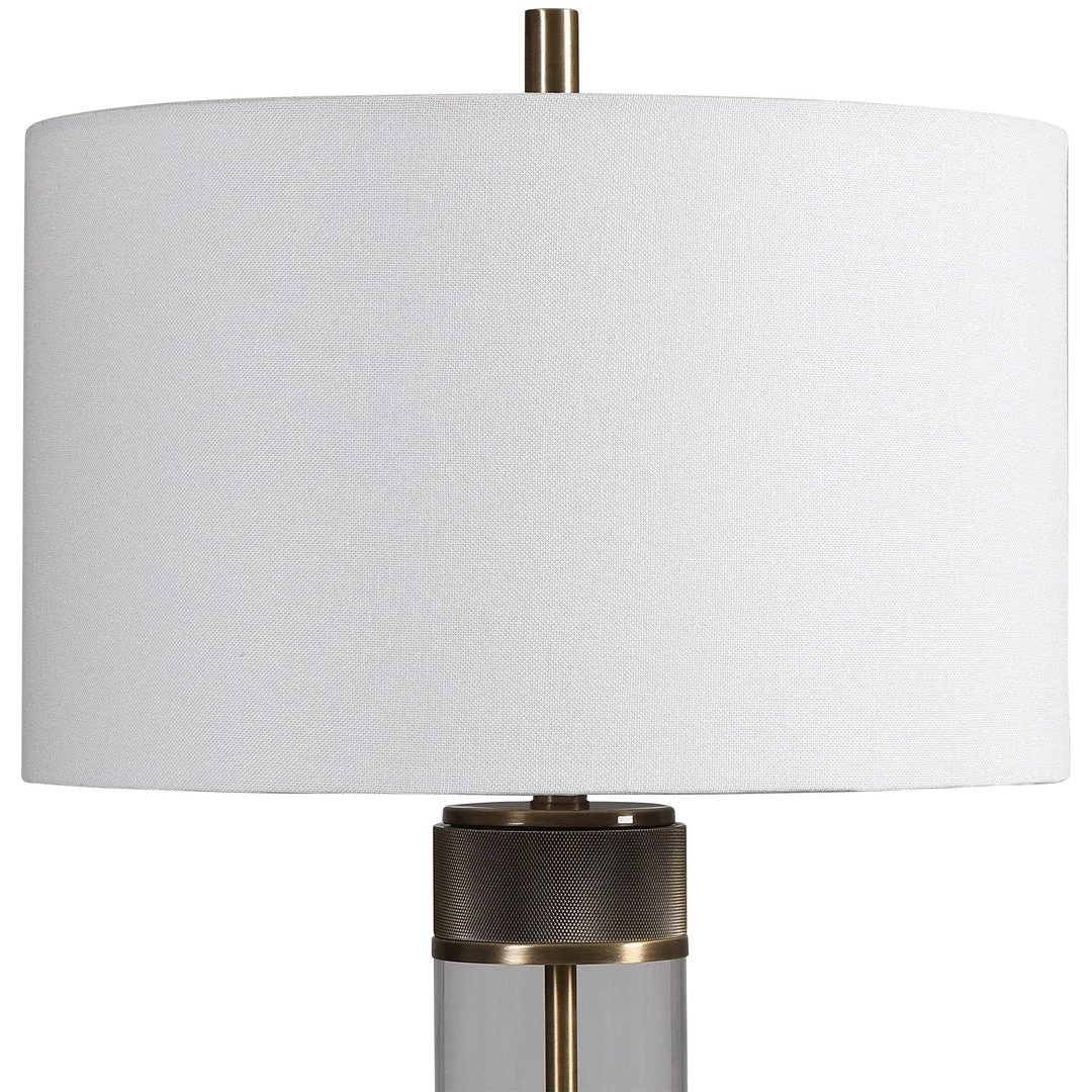 Showcasing A Clean Transitional Look, This Table Lamp Features A Clear Glass Base Accented With Antiqued Brass Plated, Heavy Textured Iron Details For A Soft Industrial Feel. The Lamp Is Paired With A White Fabric Drum Shade.