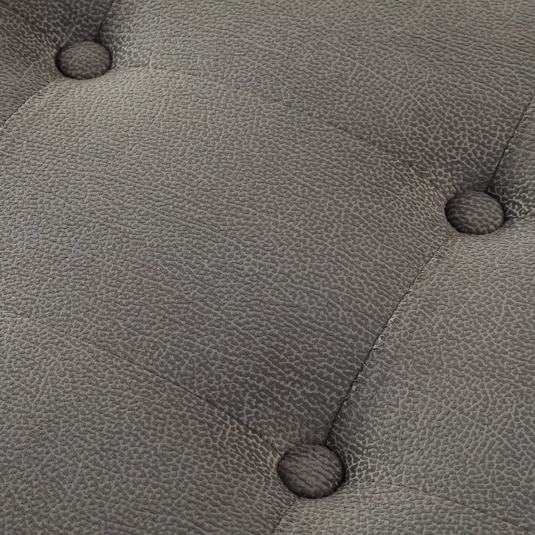 Plush And Comfortable Button Tufting In Slate Gray Crackle Textured Fabric, Featuring A Sleek Polished Stainless Steel Base.