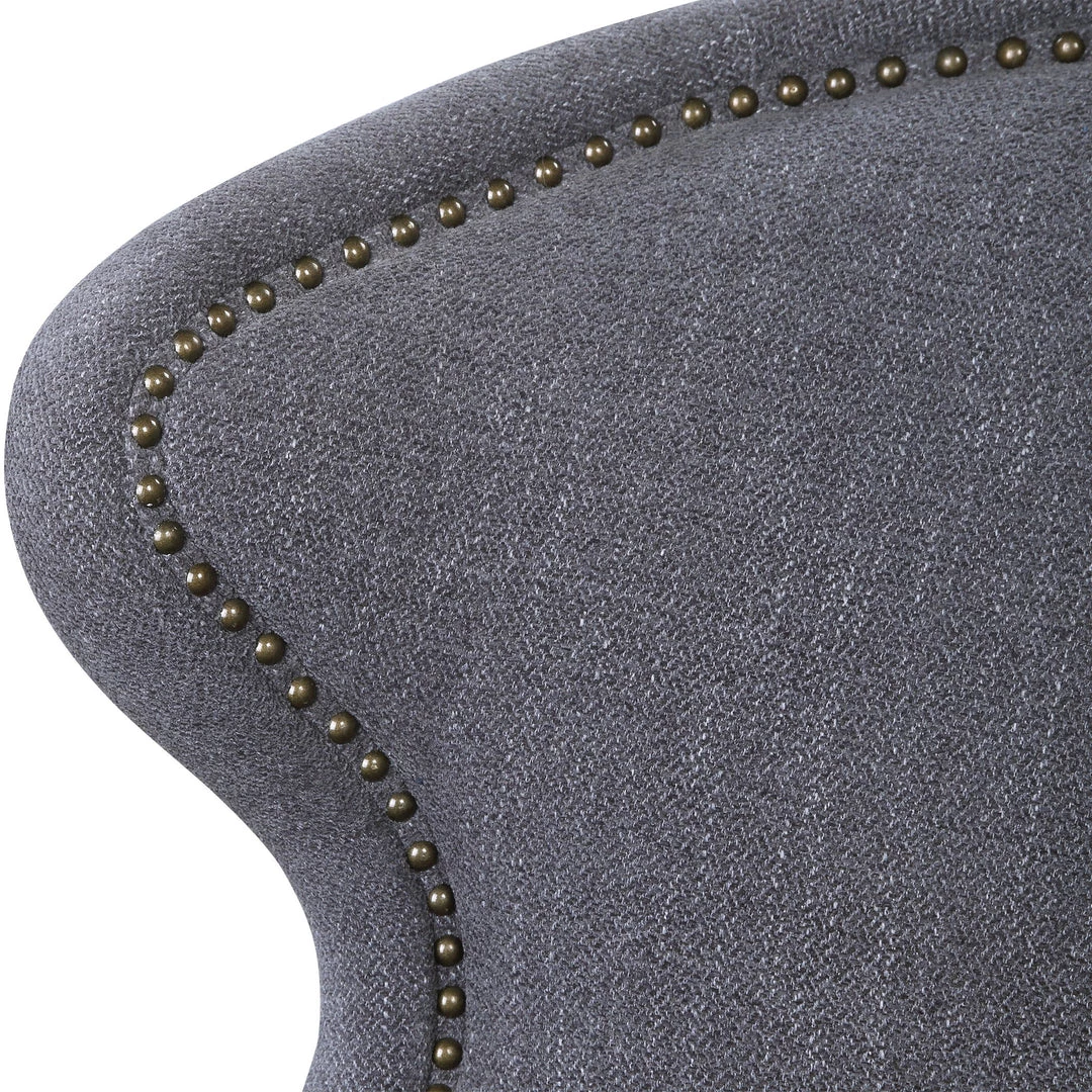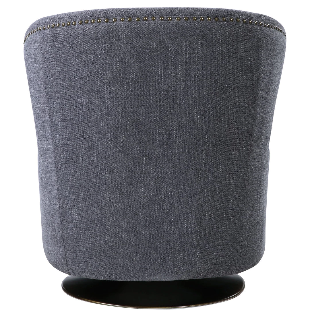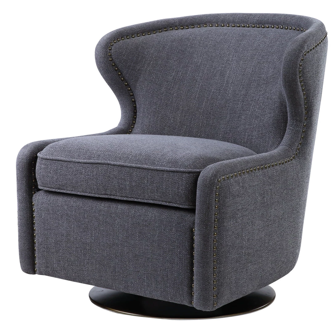 This Wingback Style Accent Chair Is Covered In A Plush Dark Charcoal Gray Herringbone Fabric, Accented With Antique Brass Nail Heads Atop An Antique Brass Finished Swivel Base. Seat Height Is 18″.