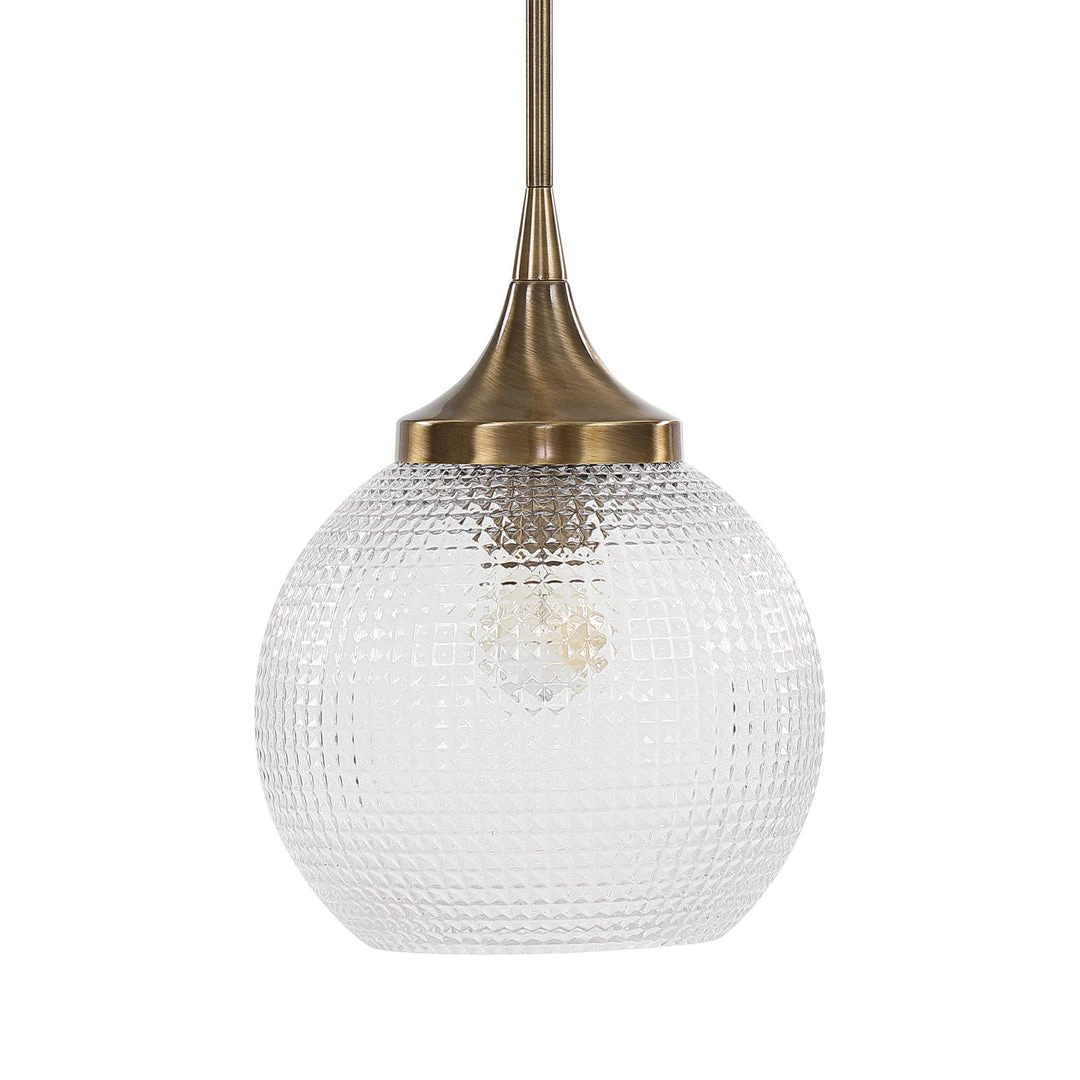 Welcoming Warm Aged Brass With Graceful, Curved Lines Holding A Clear Round Pressed Prismatic Pattern Glass In This Classic Timeless 1 Lt. Mini Pendant. With 1-100 Watt Max, Edison Socket And Includes 15′ Wire, 3-12″ Stems And 1-6″ Stem For Adjustable Installation.