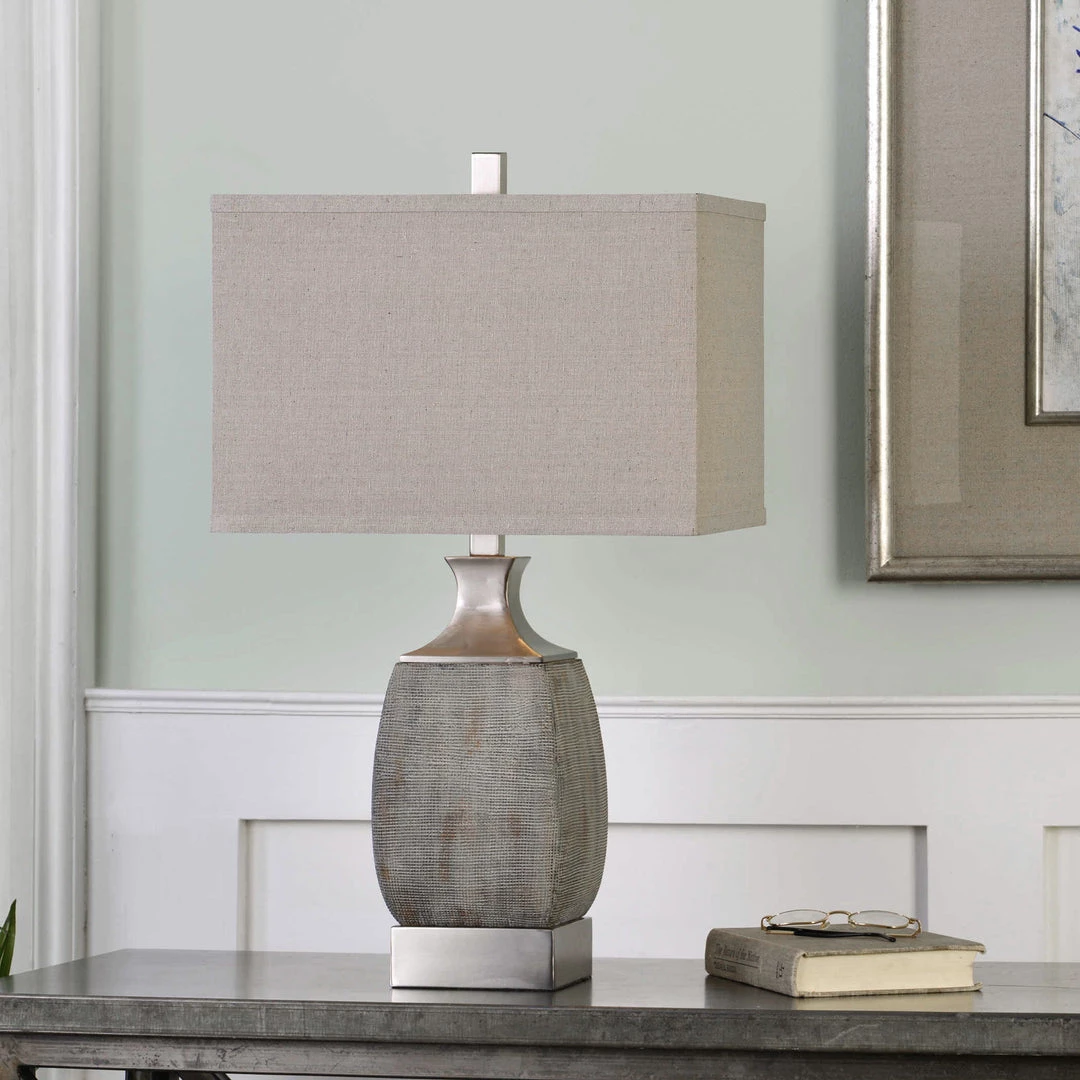 Heavily Textured Rust Bronze Ceramic Accented With Brushed Nickel Plated Metal Details. The Rectangle Hardback Drum Shade Is A Light Beige Linen Fabric. Due To The Nature Of Fired Glazes On Ceramic Lamps, Finishes Will Vary Slightly.