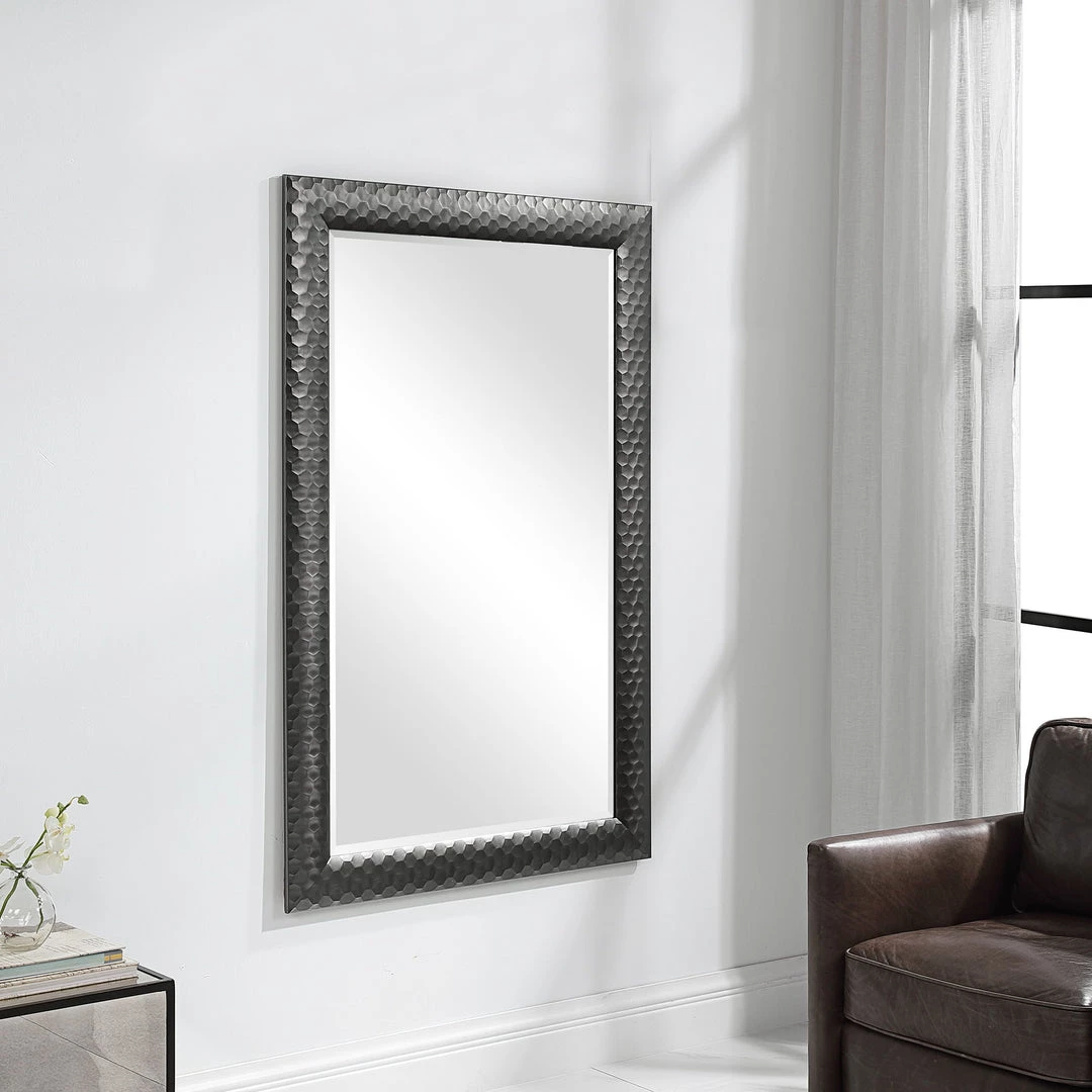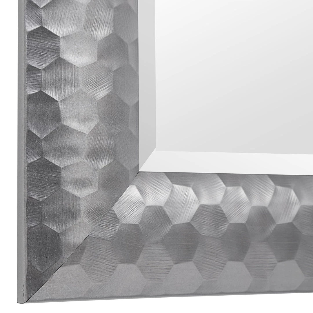 This Rectangular Mirror Has A Contemporary Style With Organic Touches By Featuring A Textured Honeycomb Pattern, Individually Concaved For Dimensional Appeal, Finished In A Gunmetal Gray. The Beveled Mirror May Be Hung Horizontal Or Vertical.