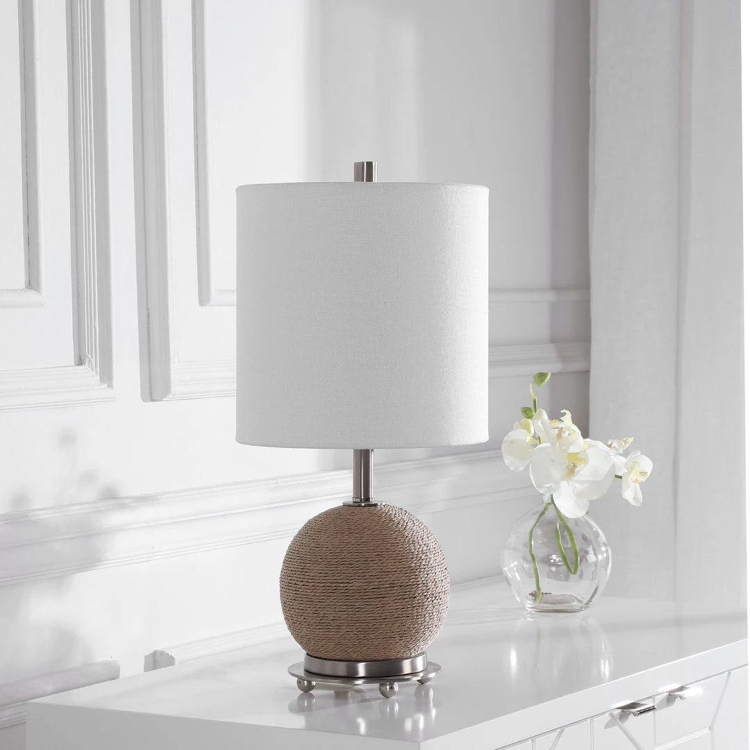 This Accent Lamp Features A Casual, Natural Braided Rattan Wrapped Exterior Accented By Brushed Nickel Plated Iron Details. A Hardback Shade In A Crisp White Linen Fabric Complements The Piece.