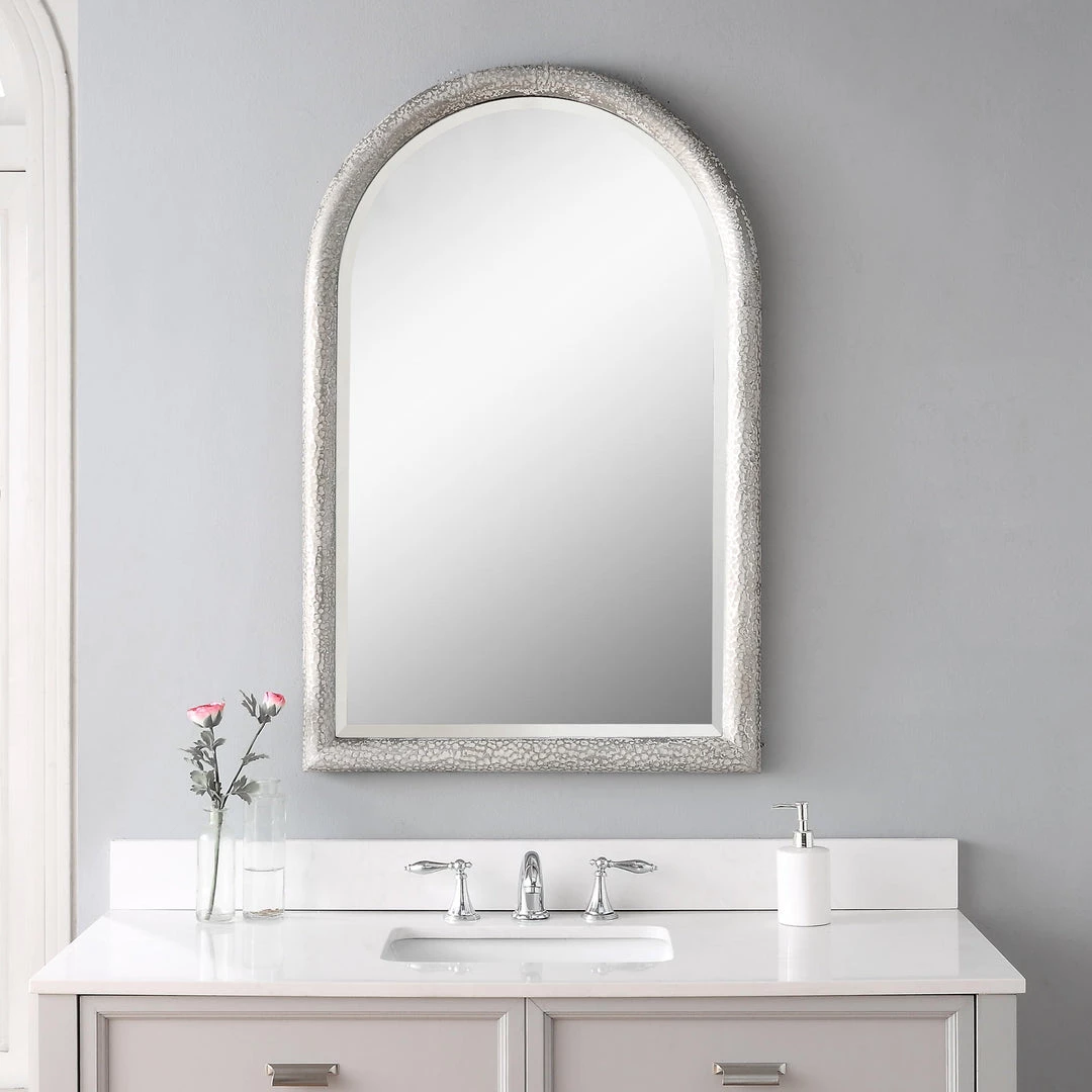 Arch Mirror Features A Forged Iron Frame With Noticeable Texture Finished In Aged Gray With Distressing And Mottled Silver Highlights. Mirror Has A Generous 1 1/4″ Bevel.