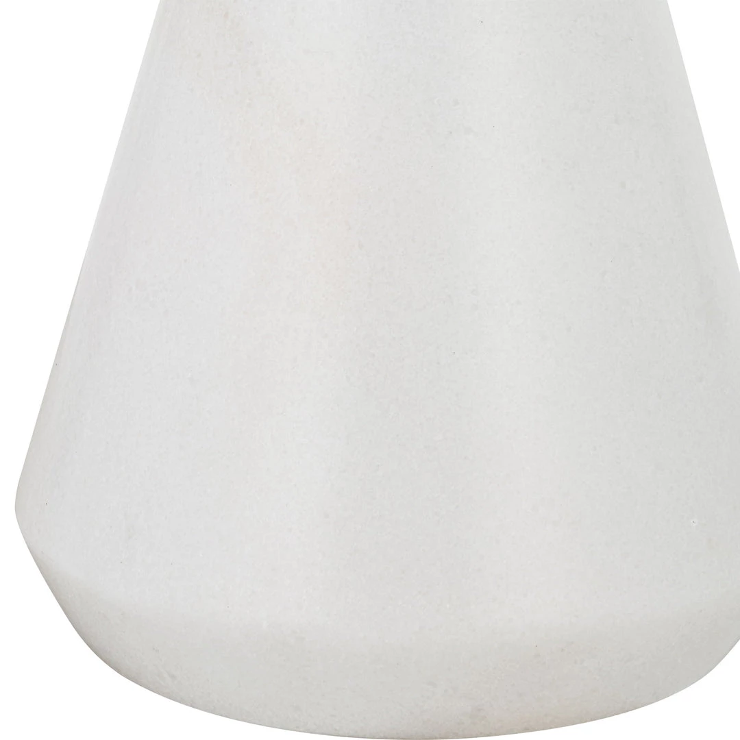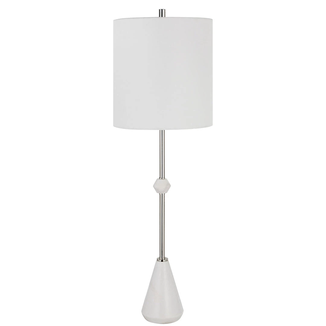 This Sophisticated Buffet Lamp Showcases An Elegant Honed White Marble Base And Decorative Detail, Paired With Polished Nickel Plated Accents. A Round Hardback Shade In White Linen Completes The Look.
